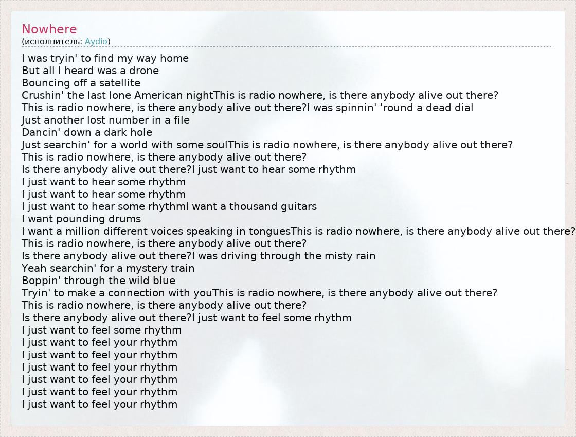 I was tryin' to find my way home But all I heard was a drone Bouncing off a satellite Crushin' the last lone American nightThis is radio nowhere, is there anybody alive out there? This is radio nowhere, is there anybody alive out there?I was spinnin' 'round a dead dial Just another lost number in a file Dancin' down a dark hole Just searchin' for a world with some soulThis is radio nowhere, is there anybody alive out there? This is radio nowhere, is there anybody alive out there? Is there anybody alive out there?I just want to hear some rhythm I just want to hear some rhythm I just want to hear some rhythm I just want to hear some rhythmI want a thousand guitars I want pounding drums I want a million different voices speaking in tonguesThis is radio nowhere, is there anybody alive out there? This is radio nowhere, is there anybody alive out there? Is there anybody alive out there?I was driving through the misty rain Yeah searchin' for a mystery train Boppin' through the wild blue Tryin' to make a connection with youThis is radio nowhere, is there anybody alive out there? This is radio nowhere, is there anybody alive out there? Is there anybody alive out there?I just want to feel some rhythm I just want to feel some rhythm I just want to feel your rhythm I just want to feel your rhythm I just want to feel your rhythm I just want to feel your rhythm I just want to feel your rhythm I just want to feel your rhythm
