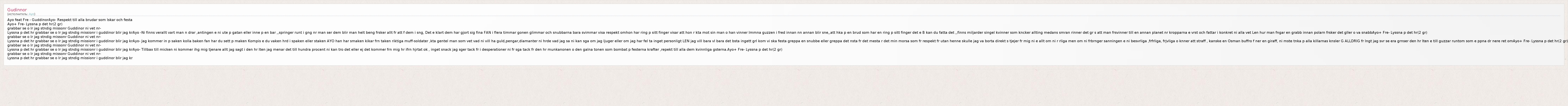 Ayo feat Fre - GuddinorAyo- Respekt till alla brudar som lskar och festa Ayo+ Fre- Lyssna p det hr(2 gr) grabbar se o lr jag stndig missonr Guddinor ni vet nr- Lyssna p det hr grabbar se o lr jag stndig missionr i guddinor blir jag krAyo -Ni finns verallt vart man n drar ,antingen e ni ute p gatan eller inne p en bar ,,springer runt i gng nr man ser dem blir man helt beng frsker allt fr att f dem i sng, Det e klart dem har gjort sig fina FAN i flera timmar gonen glimmar och snubbarna bara svimmar visa respekt omhon har ring p sitt finger visar att hon r kta mot sin man o han vinner lmmna guzzen i fred innan nn annan blir sne,,att hka p en brud som har en ring p sitt finger det e B kan du fatta det ,,finns miljarder singel kvinner som kncker allting medans smran rinner det gr s att man frsvinner till en annan planet nr kropparna e vrst och fattar i konkret ni alla vet Len hur man fngar en grabb innan polarn frsker det gller o va snabbAyo+ Fre- Lyssna p det hr(2 gr) grabbar se o lr jag stndig missonr Guddinor ni vet nr- Lyssna p det hr grabbar se o lr jag stndig missionr i guddinor blir jag krAyo- Jag kommer in p saken kolla baken fan har du sett p maken Kompis e du vaken hrd i spaken eller staken AYO han har smaken kikar frn taken riktiga muff-soldater ,kta gentel man som vet vad ni vill ha guld,pengar,diamanter ni hrde vad jag sa ni kan sga om jag ljuger eller om jag har fel ta inget personligt LEN jag vill bara vl bara det bsta ingett grl kom vi ska festa greppa en snubbe eller greppa det nsta fr det mesta r det min morsa som fr respekt fr utan henne skulle jag va borta direkt s tjejer fr mig ni e allt om ni r rliga men om ni frbrnger sanningen e ni besvrliga ,frfrliga, frjvliga o knner att straff , kanske en Osman buffro f ner en giraff, ni mste tnka p alla killarnas knsler G ALLDRIG fr lngt jag svr se era grnser den hr lten e till guzzar runtom som e ppna dr nere ret omAyo+ Fre- Lyssna p det hr(2 gr) grabbar se o lr jag stndig missonr Guddinor ni vet nr- Lyssna p det hr grabbar se o lr jag stndig missionr i guddinor blir jag krAyo- Tillbax till micken ni kommer ihg mig tjenare allt jag sagt i den hr lten jag menar det till hundra procent ni kan tro det eller ej det kommer frn mig hr ifrn hjrtat ok , inget snack jag sger tack fr i desperationer ni fr sga tack fr den hr munkanonen o den galna tonen som bombat p festerna krafter ,repekt till alla dem kvinnliga gsterna.Ayo+ Fre- Lyssna p det hr(2 gr) grabbar se o lr jag stndig missonr Guddinor ni vet nr- Lyssna p det hr grabbar se o lr jag stndig missionr i guddinor blir jag kr