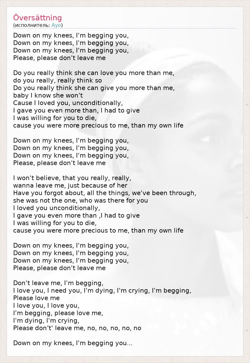 Прошу тебя, стоя перед тобой на коленях, Прошу тебя, стоя перед тобой на коленях, Прошу тебя, стоя перед тобой на коленях, Пожалуйста, пожалуйста, не уходи. Ты действительно думаешь, что она может любить тебя больше, чем я? Ты действительно, действительно думаешь так? Ты действительно думаешь, что она может любить тебя больше, чем я? Малыш, я знаю, она не может, Потому что я люблю тебя, безусловно Я могу дать тебе больше, Я готова умереть за тебя, Потому что ты значишь для меня больше, чем моя собственная жизнь. Прошу тебя, стоя перед тобой на коленях, Прошу тебя, стоя перед тобой на коленях, Прошу тебя, стоя перед тобой на коленях, Пожалуйста, пожалуйста, не уходи. Я не верю, что ты действительно, действительно уходишь от меня, Только потому, что есть она. Ты забыл, что мы пережили вместе. Разве ты не видишь, она не для тебя. Я люблю тебя, безусловно, Я могу дать тебе больше, Я готова умереть за тебя, Потому что ты значишь для меня больше, чем моя собственная жизнь. Прошу тебя, стоя перед тобой на коленях, Прошу тебя, стоя перед тобой на коленях, Прошу тебя, стоя перед тобой на коленях, Пожалуйста, пожалуйста, не уходи. Не оставляй меня, я прошу, Я люблю тебя, ты мне нужен, я умираю, я плачу, я прошу, Пожалуйста, люби меня, Я люблю тебя, Я люблю тебя, Я прошу, пожалуйста, люби меня, Я умираю, я плачу, Пожалуйста, не оставляй меня, нет, нет, нет, нет, нет Не оставляй меня, я прошу тебя….