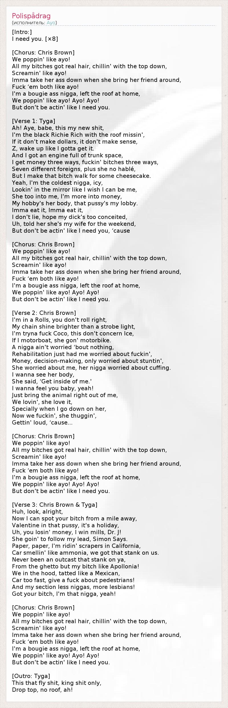 [Intro:] I need you. [×8] [Chorus: Chris Brown] We poppin' like ayo! All my bitches got real hair, chillin' with the top down, Screamin' like ayo! Imma take her ass down when she bring her friend around, Fuck ‘em both like ayo! I'm a bougie ass nigga, left the roof at home, We poppin' like ayo! Ayo! Ayo! But don't be actin' like I need you. [Verse 1: Tyga] Ah! Aye, babe, this my new shit, I'm the black Richie Rich with the roof missin', If it don't make dollars, it don't make sense, Z, wake up like I gotta get it. And I got an engine full of trunk space, I get money three ways, fuckin' bitches three ways, Seven different foreigns, plus she no hablé, But I make that bitch walk for some cheesecake. Yeah, I'm the coldest nigga, icy, Lookin' in the mirror like I wish I can be me, She too into me, I'm more into money, My hobby's her body, that pussy's my lobby. Imma eat it, Imma eat it, I don't lie, hope my dick's too conceited, Uh, told her she's my wife for the weekend, But don't be actin' like I need you, ‘cause [Chorus: Chris Brown] We poppin' like ayo! All my bitches got real hair, chillin' with the top down, Screamin' like ayo! Imma take her ass down when she bring her friend around, Fuck ‘em both like ayo! I'm a bougie ass nigga, left the roof at home, We poppin' like ayo! Ayo! Ayo! But don't be actin' like I need you. [Verse 2: Chris Brown] I'm in a Rolls, you don't roll right, My chain shine brighter than a strobe light, I'm tryna fuck Coco, this don't concern Ice, If I motorboat, she gon' motorbike. A nigga ain't worried ‘bout nothing, Rehabilitation just had me worried about fuckin', Money, decision-making, only worried about stuntin', She worried about me, her nigga worried about cuffing. I wanna see her body, She said, ‘Get inside of me.' I wanna feel you baby, yeah! Just bring the animal right out of me, We lovin', she love it, Specially when I go down on her, Now we fuckin', she thuggin', Gettin' loud, ‘cause... [Chorus: Chris Brown] We poppin' like ayo! All my bitches got real hair, chillin' with the top down, Screamin' like ayo! Imma take her ass down when she bring her friend around, Fuck ‘em both like ayo! I'm a bougie ass nigga, left the roof at home, We poppin' like ayo! Ayo! Ayo! But don't be actin' like I need you. [Verse 3: Chris Brown & Tyga] Huh, look, alright, Now I can spot your bitch from a mile away, Valentine in that pussy, it's a holiday, Uh, you losin' money, I win mills, Dr. J! She goin' to follow my lead, Simon Says. Paper, paper, I'm ridin' scrapers in California, Car smellin' like ammonia, we got that stank on us. Never been an outcast that stank on ya, From the ghetto but my bitch like Apollonia! We in the hood, tatted like a Mexican, Car too fast, give a fuck about pedestrians! And my section less niggas, more lesbians! Got your bitch, I'm that nigga, yeah! [Chorus: Chris Brown] We poppin' like ayo! All my bitches got real hair, chillin' with the top down, Screamin' like ayo! Imma take her ass down when she bring her friend around, Fuck ‘em both like ayo! I'm a bougie ass nigga, left the roof at home, We poppin' like ayo! Ayo! Ayo! But don't be actin' like I need you. [Outro: Tyga] This that fly shit, king shit only, Drop top, no roof, ah!