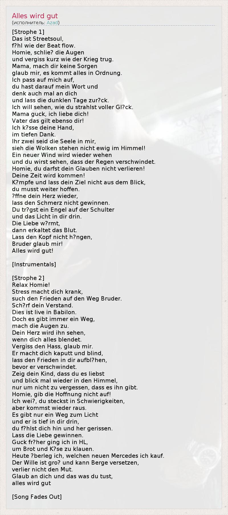 [Strophe 1] Das ist Streetsoul, f?hl wie der Beat flow. Homie, schlie? die Augen und vergiss kurz wie der Krieg trug. Mama, mach dir keine Sorgen glaub mir, es kommt alles in Ordnung. Ich pass auf mich auf, du hast darauf mein Wort und denk auch mal an dich und lass die dunklen Tage zur?ck. Ich will sehen, wie du strahlst voller Gl?ck. Mama guck, ich liebe dich! Vater das gilt ebenso dir! Ich k?sse deine Hand, im tiefen Dank. Ihr zwei seid die Seele in mir, sieh die Wolken stehen nicht ewig im Himmel! Ein neuer Wind wird wieder wehen und du wirst sehen, dass der Regen verschwindet. Homie, du darfst dein Glauben nicht verlieren! Deine Zeit wird kommen! K?mpfe und lass dein Ziel nicht aus dem Blick, du musst weiter hoffen. ?ffne dein Herz wieder, lass den Schmerz nicht gewinnen. Du tr?gst ein Engel auf der Schulter und das Licht in dir drin. Die Liebe w?rmt, dann erkaltet das Blut. Lass den Kopf nicht h?ngen, Bruder glaub mir! Alles wird gut! [Instrumentals] [Strophe 2] Relax Homie! Stress macht dich krank, such den Frieden auf den Weg Bruder. Sch?rf dein Verstand. Dies ist live in Babilon. Doch es gibt immer ein Weg, mach die Augen zu. Dein Herz wird ihn sehen, wenn dich alles blendet. Vergiss den Hass, glaub mir. Er macht dich kaputt und blind, lass den Frieden in dir aufbl?hen, bevor er verschwindet. Zeig dein Kind, dass du es liebst und blick mal wieder in den Himmel, nur um nicht zu vergessen, dass es ihn gibt. Homie, gib die Hoffnung nicht auf! Ich wei?, du steckst in Schwierigkeiten, aber kommst wieder raus. Es gibt nur ein Weg zum Licht und er is tief in dir drin, du f?hlst dich hin und her gerissen. Lass die Liebe gewinnen. Guck fr?her ging ich in HL, um Brot und K?se zu klauen. Heute ?berleg ich, welchen neuen Mercedes ich kauf. Der Wille ist gro? und kann Berge versetzen, verlier nicht den Mut. Glaub an dich und das was du tust, alles wird gut [Song Fades Out]