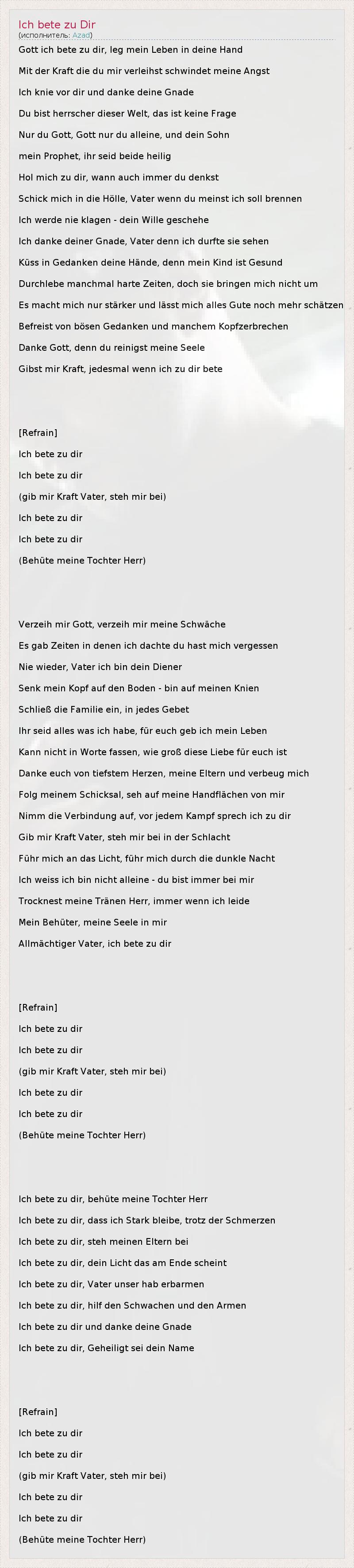 Gott ich bete zu dir, leg mein Leben in deine Hand Mit der Kraft die du mir verleihst schwindet meine Angst Ich knie vor dir und danke deine Gnade Du bist herrscher dieser Welt, das ist keine Frage Nur du Gott, Gott nur du alleine, und dein Sohn mein Prophet, ihr seid beide heilig Hol mich zu dir, wann auch immer du denkst Schick mich in die Hölle, Vater wenn du meinst ich soll brennen Ich werde nie klagen - dein Wille geschehe Ich danke deiner Gnade, Vater denn ich durfte sie sehen Küss in Gedanken deine Hände, denn mein Kind ist Gesund Durchlebe manchmal harte Zeiten, doch sie bringen mich nicht um Es macht mich nur stärker und lässt mich alles Gute noch mehr schätzen Befreist von bösen Gedanken und manchem Kopfzerbrechen Danke Gott, denn du reinigst meine Seele Gibst mir Kraft, jedesmal wenn ich zu dir bete [Refrain] Ich bete zu dir Ich bete zu dir (gib mir Kraft Vater, steh mir bei) Ich bete zu dir Ich bete zu dir (Behüte meine Tochter Herr) Verzeih mir Gott, verzeih mir meine Schwäche Es gab Zeiten in denen ich dachte du hast mich vergessen Nie wieder, Vater ich bin dein Diener Senk mein Kopf auf den Boden - bin auf meinen Knien Schließ die Familie ein, in jedes Gebet Ihr seid alles was ich habe, für euch geb ich mein Leben Kann nicht in Worte fassen, wie groß diese Liebe für euch ist Danke euch von tiefstem Herzen, meine Eltern und verbeug mich Folg meinem Schicksal, seh auf meine Handflächen von mir Nimm die Verbindung auf, vor jedem Kampf sprech ich zu dir Gib mir Kraft Vater, steh mir bei in der Schlacht Führ mich an das Licht, führ mich durch die dunkle Nacht Ich weiss ich bin nicht alleine - du bist immer bei mir Trocknest meine Tränen Herr, immer wenn ich leide Mein Behüter, meine Seele in mir Allmächtiger Vater, ich bete zu dir [Refrain] Ich bete zu dir Ich bete zu dir (gib mir Kraft Vater, steh mir bei) Ich bete zu dir Ich bete zu dir (Behüte meine Tochter Herr) Ich bete zu dir, behüte meine Tochter Herr Ich bete zu dir, dass ich Stark bleibe, trotz der Schmerzen Ich bete zu dir, steh meinen Eltern bei Ich bete zu dir, dein Licht das am Ende scheint Ich bete zu dir, Vater unser hab erbarmen Ich bete zu dir, hilf den Schwachen und den Armen Ich bete zu dir und danke deine Gnade Ich bete zu dir, Geheiligt sei dein Name [Refrain] Ich bete zu dir Ich bete zu dir (gib mir Kraft Vater, steh mir bei) Ich bete zu dir Ich bete zu dir (Behüte meine Tochter Herr)