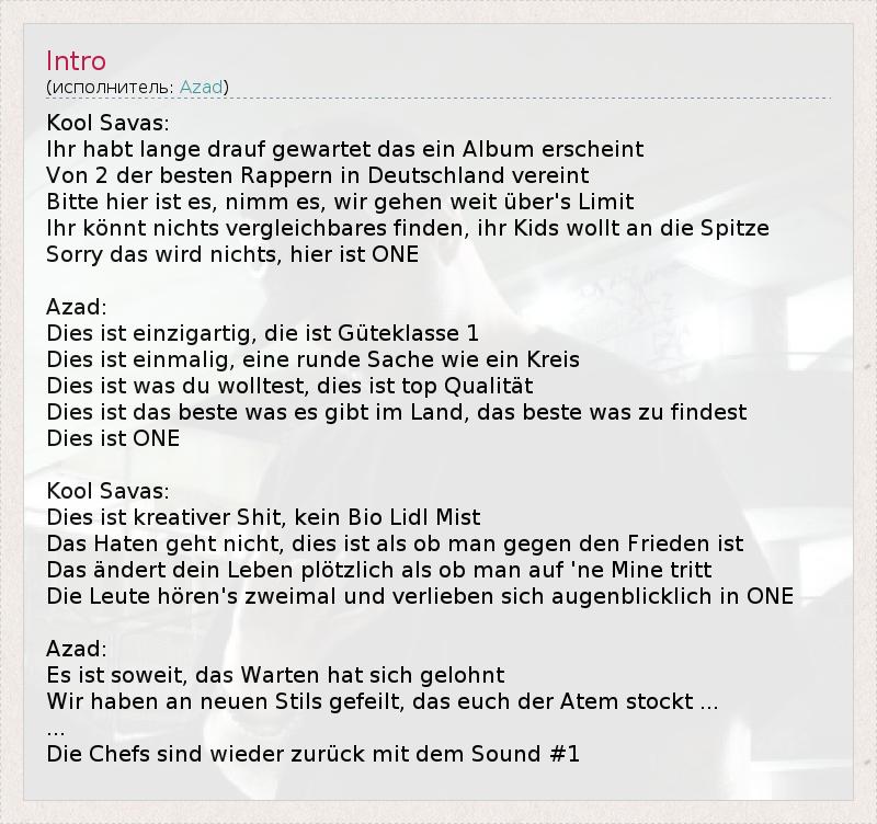 Kool Savas: Ihr habt lange drauf gewartet das ein Album erscheint Von 2 der besten Rappern in Deutschland vereint Bitte hier ist es, nimm es, wir gehen weit über's Limit Ihr könnt nichts vergleichbares finden, ihr Kids wollt an die Spitze Sorry das wird nichts, hier ist ONE Azad: Dies ist einzigartig, die ist Güteklasse 1 Dies ist einmalig, eine runde Sache wie ein Kreis Dies ist was du wolltest, dies ist top Qualität Dies ist das beste was es gibt im Land, das beste was zu findest Dies ist ONE Kool Savas: Dies ist kreativer Shit, kein Bio Lidl Mist Das Haten geht nicht, dies ist als ob man gegen den Frieden ist Das ändert dein Leben plötzlich als ob man auf 'ne Mine tritt Die Leute hören's zweimal und verlieben sich augenblicklich in ONE Azad: Es ist soweit, das Warten hat sich gelohnt Wir haben an neuen Stils gefeilt, das euch der Atem stockt ... ... Die Chefs sind wieder zurück mit dem Sound #1