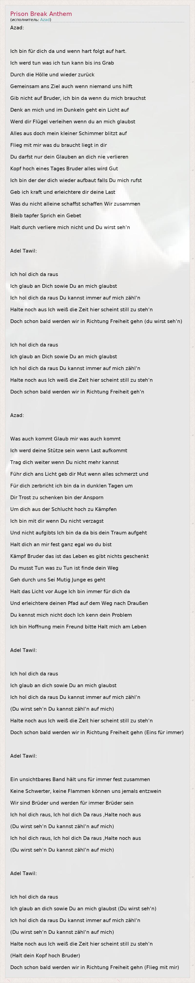 Azad: Ich bin für dich da und wenn hart folgt auf hart. Ich werd tun was ich tun kann bis ins Grab Durch die Hölle und wieder zurück Gemeinsam ans Ziel auch wenn niemand uns hilft Gib nicht auf Bruder, ich bin da wenn du mich brauchst Denk an mich und im Dunkeln geht ein Licht auf Werd dir Flügel verleihen wenn du an mich glaubst Alles aus doch mein kleiner Schimmer blitzt auf Flieg mit mir was du braucht liegt in dir Du darfst nur dein Glauben an dich nie verlieren Kopf hoch eines Tages Bruder alles wird Gut Ich bin der der dich wieder aufbaut falls Du mich rufst Geb ich kraft und erleichtere dir deine Last Was du nicht alleine schaffst schaffen Wir zusammen Bleib tapfer Sprich ein Gebet Halt durch verliere mich nicht und Du wirst seh'n Adel Tawil: Ich hol dich da raus Ich glaub an Dich sowie Du an mich glaubst Ich hol dich da raus Du kannst immer auf mich zähl'n Halte noch aus Ich weiß die Zeit hier scheint still zu steh'n Doch schon bald werden wir in Richtung Freiheit gehn (du wirst seh'n) Ich hol dich da raus Ich glaub an Dich sowie Du an mich glaubst Ich hol dich da raus Du kannst immer auf mich zähl'n Halte noch aus Ich weiß die Zeit hier scheint still zu steh'n Doch schon bald werden wir in Richtung Freiheit geh'n Azad: Was auch kommt Glaub mir was auch kommt Ich werd deine Stütze sein wenn Last aufkommt Trag dich weiter wenn Du nicht mehr kannst Führ dich ans Licht geb dir Mut wenn alles schmerzt und Für dich zerbricht ich bin da in dunklen Tagen um Dir Trost zu schenken bin der Ansporn Um dich aus der Schlucht hoch zu Kämpfen Ich bin mit dir wenn Du nicht verzagst Und nicht aufgibts Ich bin da da bis dein Traum aufgeht Halt dich an mir fest ganz egal wo du bist Kämpf Bruder das ist das Leben es gibt nichts geschenkt Du musst Tun was zu Tun ist finde dein Weg Geh durch uns Sei Mutig Junge es geht Halt das Licht vor Auge Ich bin immer für dich da Und erleichtere deinen Pfad auf dem Weg nach Draußen Du kennst mich nicht doch Ich kenn dein Problem Ich bin Hoffnung mein Freund bitte Halt mich am Leben Adel Tawil: Ich hol dich da raus Ich glaub an dich sowie Du an mich glaubst Ich hol dich da raus Du kannst immer auf mich zähl'n (Du wirst seh'n Du kannst zähl'n auf mich) Halte noch aus Ich weiß die Zeit hier scheint still zu steh'n Doch schon bald werden wir in Richtung Freiheit gehn (Eins für immer) Adel Tawil: Ein unsichtbares Band hält uns für immer fest zusammen Keine Schwerter, keine Flammen können uns jemals entzwein Wir sind Brüder und werden für immer Brüder sein Ich hol dich raus, Ich hol dich Da raus ,Halte noch aus (Du wirst seh'n Du kannst zähl'n auf mich) Ich hol dich raus, Ich hol dich Da raus ,Halte noch aus (Du wirst seh'n Du kannst zähl'n auf mich) Adel Tawil: Ich hol dich da raus Ich glaub an dich sowie Du an mich glaubst (Du wirst seh'n) Ich hol dich da raus Du kannst immer auf mich zähl'n (Du wirst seh'n Du kannst zähl'n auf mich) Halte noch aus Ich weiß die Zeit hier scheint still zu steh'n (Halt dein Kopf hoch Bruder) Doch schon bald werden wir in Richtung Freiheit gehn (Flieg mit mir)