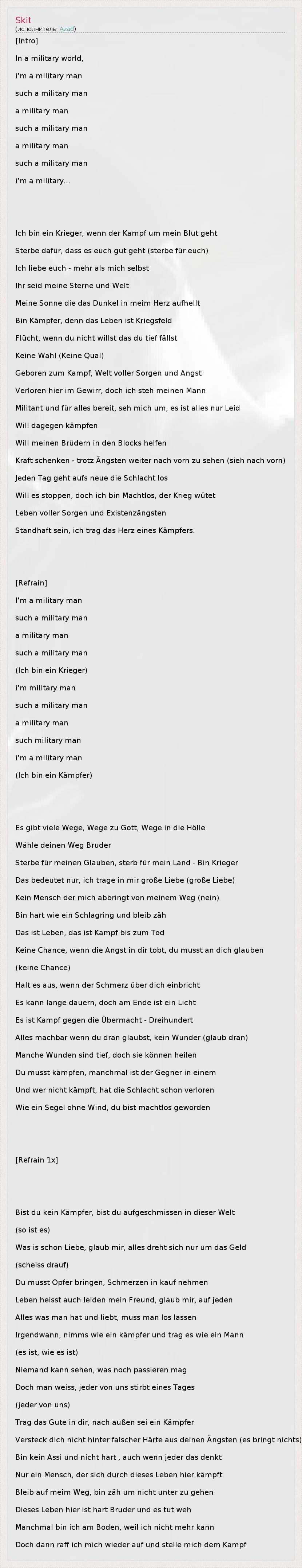 [Intro] In a military world, i'm a military man such a military man a military man such a military man a military man such a military man i'm a military... Ich bin ein Krieger, wenn der Kampf um mein Blut geht Sterbe dafür, dass es euch gut geht (sterbe für euch) Ich liebe euch - mehr als mich selbst Ihr seid meine Sterne und Welt Meine Sonne die das Dunkel in meim Herz aufhellt Bin Kämpfer, denn das Leben ist Kriegsfeld Flücht, wenn du nicht willst das du tief fällst Keine Wahl (Keine Qual) Geboren zum Kampf, Welt voller Sorgen und Angst Verloren hier im Gewirr, doch ich steh meinen Mann Militant und für alles bereit, seh mich um, es ist alles nur Leid Will dagegen kämpfen Will meinen Brüdern in den Blocks helfen Kraft schenken - trotz Ängsten weiter nach vorn zu sehen (sieh nach vorn) Jeden Tag geht aufs neue die Schlacht los Will es stoppen, doch ich bin Machtlos, der Krieg wütet Leben voller Sorgen und Existenzängsten Standhaft sein, ich trag das Herz eines Kämpfers. [Refrain] I'm a military man such a military man a military man such a military man (Ich bin ein Krieger) i'm military man such a military man a military man such military man i'm a military man (Ich bin ein Kämpfer) Es gibt viele Wege, Wege zu Gott, Wege in die Hölle Wähle deinen Weg Bruder Sterbe für meinen Glauben, sterb für mein Land - Bin Krieger Das bedeutet nur, ich trage in mir große Liebe (große Liebe) Kein Mensch der mich abbringt von meinem Weg (nein) Bin hart wie ein Schlagring und bleib zäh Das ist Leben, das ist Kampf bis zum Tod Keine Chance, wenn die Angst in dir tobt, du musst an dich glauben (keine Chance) Halt es aus, wenn der Schmerz über dich einbricht Es kann lange dauern, doch am Ende ist ein Licht Es ist Kampf gegen die Übermacht - Dreihundert Alles machbar wenn du dran glaubst, kein Wunder (glaub dran) Manche Wunden sind tief, doch sie können heilen Du musst kämpfen, manchmal ist der Gegner in einem Und wer nicht kämpft, hat die Schlacht schon verloren Wie ein Segel ohne Wind, du bist machtlos geworden [Refrain 1x] Bist du kein Kämpfer, bist du aufgeschmissen in dieser Welt (so ist es) Was is schon Liebe, glaub mir, alles dreht sich nur um das Geld (scheiss drauf) Du musst Opfer bringen, Schmerzen in kauf nehmen Leben heisst auch leiden mein Freund, glaub mir, auf jeden Alles was man hat und liebt, muss man los lassen Irgendwann, nimms wie ein kämpfer und trag es wie ein Mann (es ist, wie es ist) Niemand kann sehen, was noch passieren mag Doch man weiss, jeder von uns stirbt eines Tages (jeder von uns) Trag das Gute in dir, nach außen sei ein Kämpfer Versteck dich nicht hinter falscher Härte aus deinen Ängsten (es bringt nichts) Bin kein Assi und nicht hart , auch wenn jeder das denkt Nur ein Mensch, der sich durch dieses Leben hier kämpft Bleib auf meim Weg, bin zäh um nicht unter zu gehen Dieses Leben hier ist hart Bruder und es tut weh Manchmal bin ich am Boden, weil ich nicht mehr kann Doch dann raff ich mich wieder auf und stelle mich dem Kampf