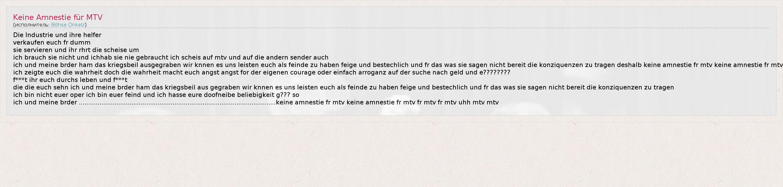 Die Industrie und ihre helfer verkaufen euch fr dumm sie servieren und ihr rhrt die scheise um ich brauch sie nicht und ichhab sie nie gebraucht ich scheis auf mtv und auf die andern sender auch ich und meine brder ham das kriegsbeil ausgegraben wir knnen es uns leisten euch als feinde zu haben feige und bestechlich und fr das was sie sagen nicht bereit die konziquenzen zu tragen deshalb keine amnestie fr mtv keine amnestie fr mtv ich zeigte euch die wahrheit doch die wahrheit macht euch angst angst for der eigenen courage oder einfach arroganz auf der suche nach geld und e???????? f***t ihr euch durchs leben und f***t die die euch sehn ich und meine brder ham das kriegsbeil aus gegraben wir knnen es uns leisten euch als feinde zu haben feige und bestechlich und fr das was sie sagen nicht bereit die konziquenzen zu tragen ich bin nicht euer oper ich bin euer feind und ich hasse eure doofneibe beliebigkeit g??? so ich und meine brder .........................................................................................................keine amnestie fr mtv keine amnestie fr mtv fr mtv fr mtv uhh mtv mtv