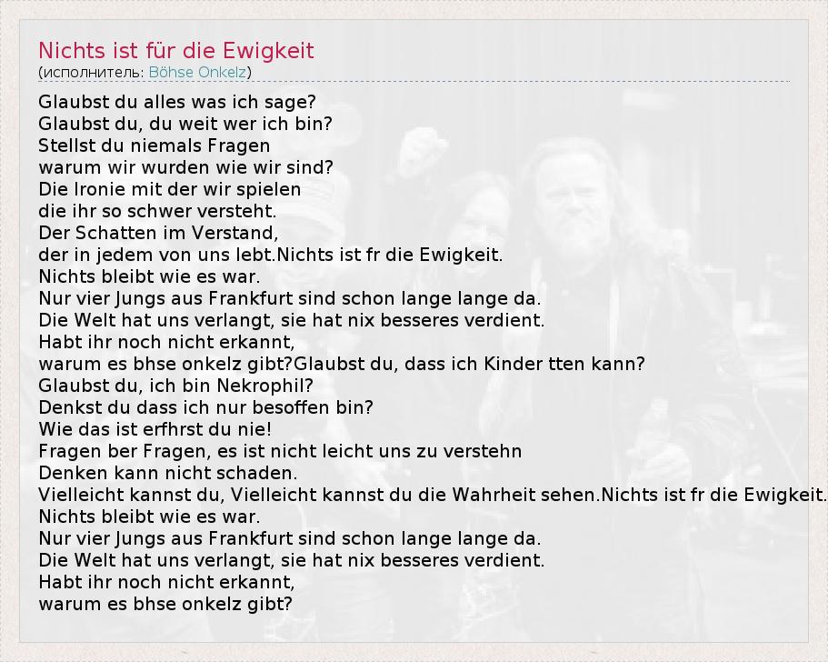 Glaubst du alles was ich sage? Glaubst du, du weit wer ich bin? Stellst du niemals Fragen warum wir wurden wie wir sind? Die Ironie mit der wir spielen die ihr so schwer versteht. Der Schatten im Verstand, der in jedem von uns lebt.Nichts ist fr die Ewigkeit. Nichts bleibt wie es war. Nur vier Jungs aus Frankfurt sind schon lange lange da. Die Welt hat uns verlangt, sie hat nix besseres verdient. Habt ihr noch nicht erkannt, warum es bhse onkelz gibt?Glaubst du, dass ich Kinder tten kann? Glaubst du, ich bin Nekrophil? Denkst du dass ich nur besoffen bin? Wie das ist erfhrst du nie! Fragen ber Fragen, es ist nicht leicht uns zu verstehn Denken kann nicht schaden. Vielleicht kannst du, Vielleicht kannst du die Wahrheit sehen.Nichts ist fr die Ewigkeit. Nichts bleibt wie es war. Nur vier Jungs aus Frankfurt sind schon lange lange da. Die Welt hat uns verlangt, sie hat nix besseres verdient. Habt ihr noch nicht erkannt, warum es bhse onkelz gibt?