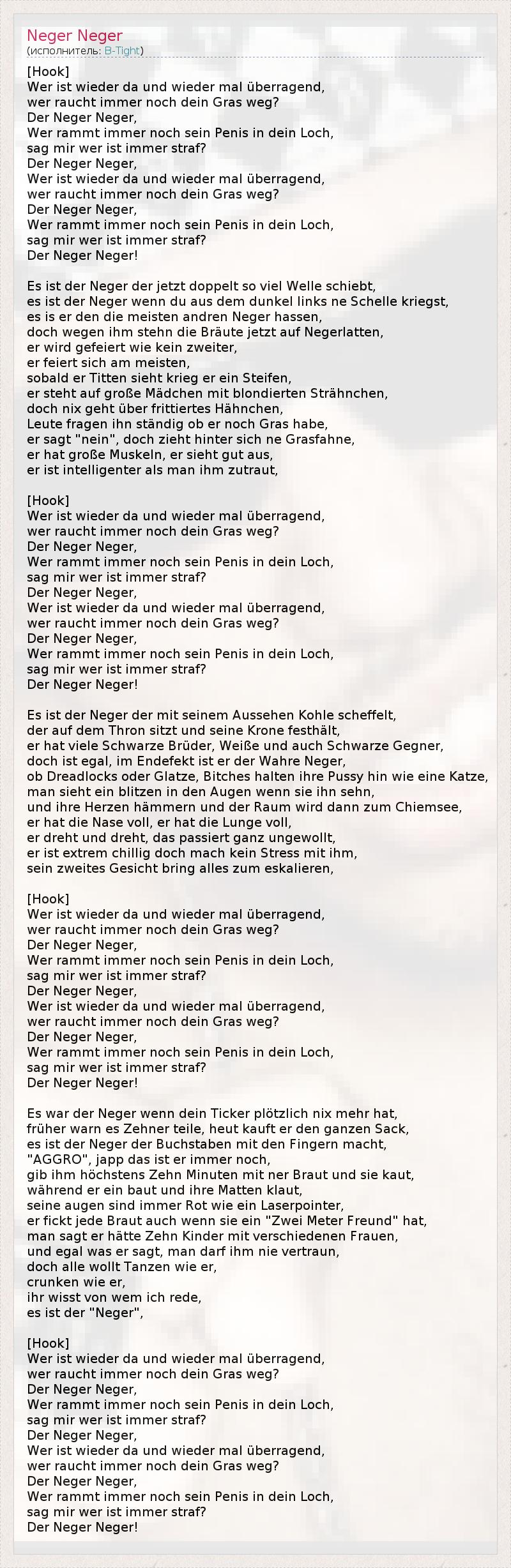[ Припев] Wer IST Wieder да унд Wieder мал überragend , WER raucht Immer Noch Дейн Gras Weg ? Der Негер Негер , Wer rammt Immer Noch Sein пениса в DEIN Лох, SAG мир Wer циональный IMMER STRAF ? Der Негер Негер , Wer IST Wieder да унд Wieder мал überragend , WER raucht Immer Noch Дейн Gras Weg ? Der Негер Негер , Wer rammt Immer Noch Sein пениса в DEIN Лох, SAG мир Wer циональный IMMER STRAF ? Der Негер Негер ! Es IST дер Негер дер Jetzt doppelt так Вьель Welle schiebt , ES IST дер Негер Венна -дю- AUS DEM дункеля ссылки пе Schelle kriegst , ЭС э -ден- умереть meisten Andren Негер Хассен , Дочь Wegen ИГД Stehn умереть Bräute Jetzt Ауф Negerlatten , э Wird gefeiert Wie Kein zweiter , э feiert Сич утра meisten , sobald э Titten sieht криг э Эйн Steifen , э steht Auf große Mädchen мит blondierten Strähnchen , Дочь Никс Geht über frittiertes Hähnchen , Leute Fragen IHN ständig об- э-э Ночь Gras хабе , э САГТ и Quot; пет и Quot ;, Дочь zieht Hinter Сич пе Grasfahne , э шляпа große Muskeln , э-э sieht кишки AUS, э IST intelligenter ALS человек ИГД zutraut , [ Припев] Wer IST Wieder да унд Wieder мал überragend , WER raucht Immer Noch Дейн Gras Weg ? Der Негер Негер , Wer rammt Immer Noch Sein пениса в DEIN Лох, SAG мир Wer циональный IMMER STRAF ? Der Негер Негер , Wer IST Wieder да унд Wieder мал überragend , WER raucht Immer Noch Дейн Gras Weg ? Der Негер Негер , Wer rammt Immer Noch Sein пениса в DEIN Лох, SAG мир Wer циональный IMMER STRAF ? Der Негер Негер ! Es IST дер Негер дер мит seinem Aussehen Kohle scheffelt , дер Auf Dem Thron sitzt унд невод Krone festhält , э шляпа Viele Шварце Brüder , Weiße унд Ош Шварце Gegner , Дочь IST Эгал , им Endefekt IST э -дер- Wahre Негер , об- дреды Одер Glatze , суки Halten Ире Pussy хин Wie сделайте Katze , человек sieht Эйн Blitzen в ден Augen Венна Sie IHN Sehn , Und Ире Герцена hämmern унд дер Raum Wird Данн Zum Кимзее , э шляпа умереть NASE Фолля , э-э шляпа умереть выпад Фолля , э dreht унд dreht , Das passiert Ганц ungewollt , э IST Экстремальная chillig Дочь Маха Kein Стресс MIT ИГД , Sein Zweites Gesicht принести Alles Zum eskalieren , [ Припев] Wer IST Wieder да унд Wieder мал überragend , WER raucht Immer Noch Дейн Gras Weg ? Der Негер Негер , Wer rammt Immer Noch Sein пениса в DEIN Лох, SAG мир Wer циональный IMMER STRAF ? Der Негер Негер , Wer IST Wieder да унд Wieder мал überragend , WER raucht Immer Noch Дейн Gras Weg ? Der Негер Негер , Wer rammt Immer Noch Sein пениса в DEIN Лох, SAG мир Wer циональный IMMER STRAF ? Der Негер Негер ! Es войны дер Негер Венна Дейн Код plötzlich Никс Mehr шляпа, früher предупредить ES Zehner TEILE , heut kauft э -ден- Ганзен мешок , ES IST дер Негер дер Buchstaben MIT ден Fingern Macht , и Quot; агро & Quot ;, Джепп дас ист э Immer Noch , планки ИГД höchstens Zehn Minuten MIT нер Braut унд Sie Kaut , während э Эйн baut унд Ihre Интерлакен klaut , Сены очкового Синд Immer Рот Wie Эйн Laserpointer , э fickt Jede Braut Ош Венна Sie Эйн - Quot; Zwei метр Фройнд и Quot; шляпа, человек САГТ э hätte Zehn Kinder MIT verschiedenen Женщины , унд Эгал был ER САГТ , человек Darf ИГД ние vertraun , Дочь Все wollt Tanzen Wie ER, crunken Wie э-э, ММСП wisst фон ОРЭ ич Рид , ES IST дер & Quot; Негер и Quot ;, [ Припев] Wer IST Wieder да унд Wieder мал überragend , WER raucht Immer Noch Дейн Gras Weg ? Der Негер Негер , Wer rammt Immer Noch Sein пениса в DEIN Лох, SAG мир Wer циональный IMMER STRAF ? Der Негер Негер , Wer IST Wieder да унд Wieder мал überragend , WER raucht Immer Noch Дейн Gras Weg ? Der Негер Негер , Wer rammt Immer Noch Sein пениса в DEIN Лох, SAG мир Wer циональный IMMER STRAF ? Der Негер Негер !