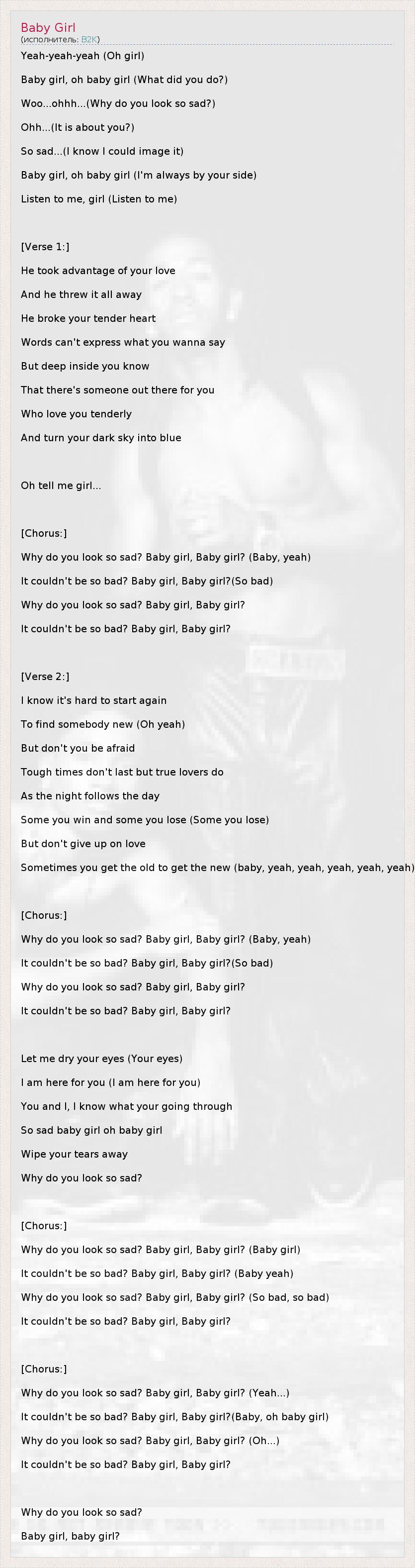 Why do you look so sad? Baby girl, Baby girl? (Baby, yeah)