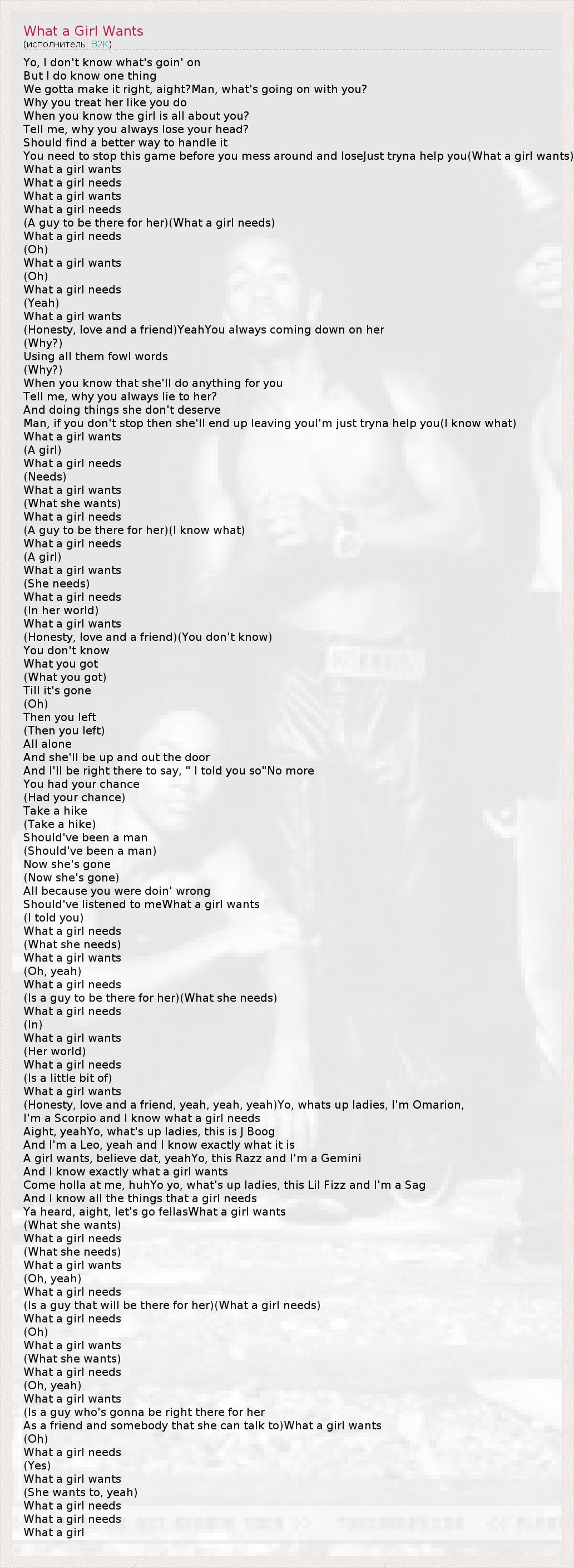 Yo, I don't know what's goin' on But I do know one thing We gotta make it right, aight?Man, what's going on with you? Why you treat her like you do When you know the girl is all about you? Tell me, why you always lose your head? Should find a better way to handle it You need to stop this game before you mess around and loseJust tryna help you(What a girl wants) What a girl wants What a girl needs What a girl wants What a girl needs (A guy to be there for her)(What a girl needs) What a girl needs (Oh) What a girl wants (Oh) What a girl needs (Yeah) What a girl wants (Honesty, love and a friend)YeahYou always coming down on her (Why?) Using all them fowl words (Why?) When you know that she'll do anything for you Tell me, why you always lie to her? And doing things she don't deserve Man, if you don't stop then she'll end up leaving youI'm just tryna help you(I know what) What a girl wants (A girl) What a girl needs (Needs) What a girl wants (What she wants) What a girl needs (A guy to be there for her)(I know what) What a girl needs (A girl) What a girl wants (She needs) What a girl needs (In her world) What a girl wants (Honesty, love and a friend)(You don't know) You don't know What you got (What you got) Till it's gone (Oh) Then you left (Then you left) All alone And she'll be up and out the door And I'll be right there to say, " I told you so"No more You had your chance (Had your chance) Take a hike (Take a hike) Should've been a man (Should've been a man) Now she's gone (Now she's gone) All because you were doin' wrong Should've listened to meWhat a girl wants (I told you) What a girl needs (What she needs) What a girl wants (Oh, yeah) What a girl needs (Is a guy to be there for her)(What she needs) What a girl needs (In) What a girl wants (Her world) What a girl needs (Is a little bit of) What a girl wants (Honesty, love and a friend, yeah, yeah, yeah)Yo, whats up ladies, I'm Omarion, I'm a Scorpio and I know what a girl needs Aight, yeahYo, what's up ladies, this is J Boog And I'm a Leo, yeah and I know exactly what it is A girl wants, believe dat, yeahYo, this Razz and I'm a Gemini And I know exactly what a girl wants Come holla at me, huhYo yo, what's up ladies, this Lil Fizz and I'm a Sag And I know all the things that a girl needs Ya heard, aight, let's go fellasWhat a girl wants (What she wants) What a girl needs (What she needs) What a girl wants (Oh, yeah) What a girl needs (Is a guy that will be there for her)(What a girl needs) What a girl needs (Oh) What a girl wants (What she wants) What a girl needs (Oh, yeah) What a girl wants (Is a guy who's gonna be right there for her As a friend and somebody that she can talk to)What a girl wants (Oh) What a girl needs (Yes) What a girl wants (She wants to, yeah) What a girl needs What a girl needs What a girl