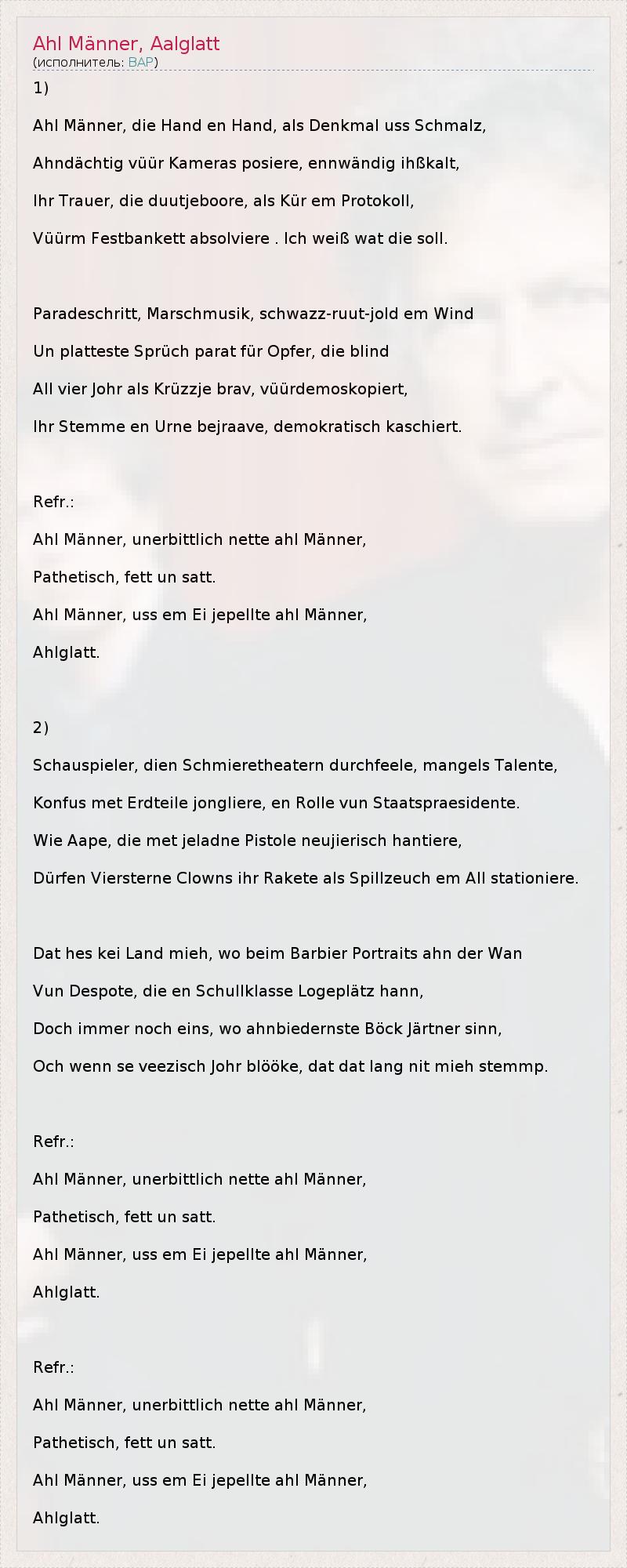 1) Ahl Männer, die Hand en Hand, als Denkmal uss Schmalz, Ahndächtig vüür Kameras posiere, ennwändig ihßkalt, Ihr Trauer, die duutjeboore, als Kür em Protokoll, Vüürm Festbankett absolviere . Ich weiß wat die soll. Paradeschritt, Marschmusik, schwazz-ruut-jold em Wind Un platteste Sprüch parat für Opfer, die blind All vier Johr als Krüzzje brav, vüürdemoskopiert, Ihr Stemme en Urne bejraave, demokratisch kaschiert. Refr.: Ahl Männer, unerbittlich nette ahl Männer, Pathetisch, fett un satt. Ahl Männer, uss em Ei jepellte ahl Männer, Ahlglatt. 2) Schauspieler, dien Schmieretheatern durchfeele, mangels Talente, Konfus met Erdteile jongliere, en Rolle vun Staatspraesidente. Wie Aape, die met jeladne Pistole neujierisch hantiere, Dürfen Viersterne Clowns ihr Rakete als Spillzeuch em All stationiere. Dat hes kei Land mieh, wo beim Barbier Portraits ahn der Wan Vun Despote, die en Schullklasse Logeplätz hann, Doch immer noch eins, wo ahnbiedernste Böck Järtner sinn, Och wenn se veezisch Johr blööke, dat dat lang nit mieh stemmp. Refr.: Ahl Männer, unerbittlich nette ahl Männer, Pathetisch, fett un satt. Ahl Männer, uss em Ei jepellte ahl Männer, Ahlglatt. Refr.: Ahl Männer, unerbittlich nette ahl Männer, Pathetisch, fett un satt. Ahl Männer, uss em Ei jepellte ahl Männer, Ahlglatt.