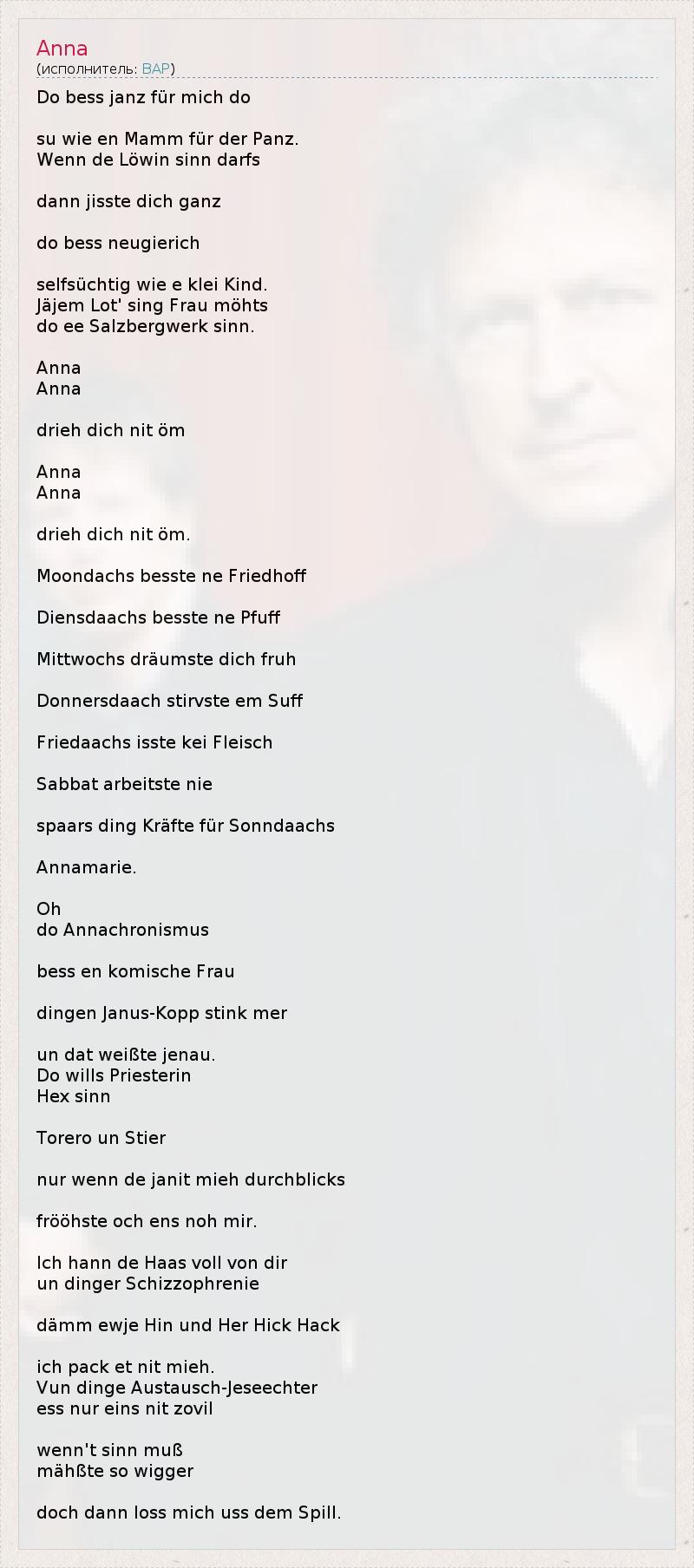 Do bess janz für mich do su wie en Mamm für der Panz. Wenn de Löwin sinn darfs dann jisste dich ganz do bess neugierich selfsüchtig wie e klei Kind. Jäjem Lot' sing Frau möhts do ee Salzbergwerk sinn. Anna Anna drieh dich nit öm Anna Anna drieh dich nit öm. Moondachs besste ne Friedhoff Diensdaachs besste ne Pfuff Mittwochs dräumste dich fruh Donnersdaach stirvste em Suff Friedaachs isste kei Fleisch Sabbat arbeitste nie spaars ding Kräfte für Sonndaachs Annamarie. Oh do Annachronismus bess en komische Frau dingen Janus-Kopp stink mer un dat weißte jenau. Do wills Priesterin Hex sinn Torero un Stier nur wenn de janit mieh durchblicks frööhste och ens noh mir. Ich hann de Haas voll von dir un dinger Schizzophrenie dämm ewje Hin und Her Hick Hack ich pack et nit mieh. Vun dinge Austausch-Jeseechter ess nur eins nit zovil wenn't sinn muß mähßte so wigger doch dann loss mich uss dem Spill.
