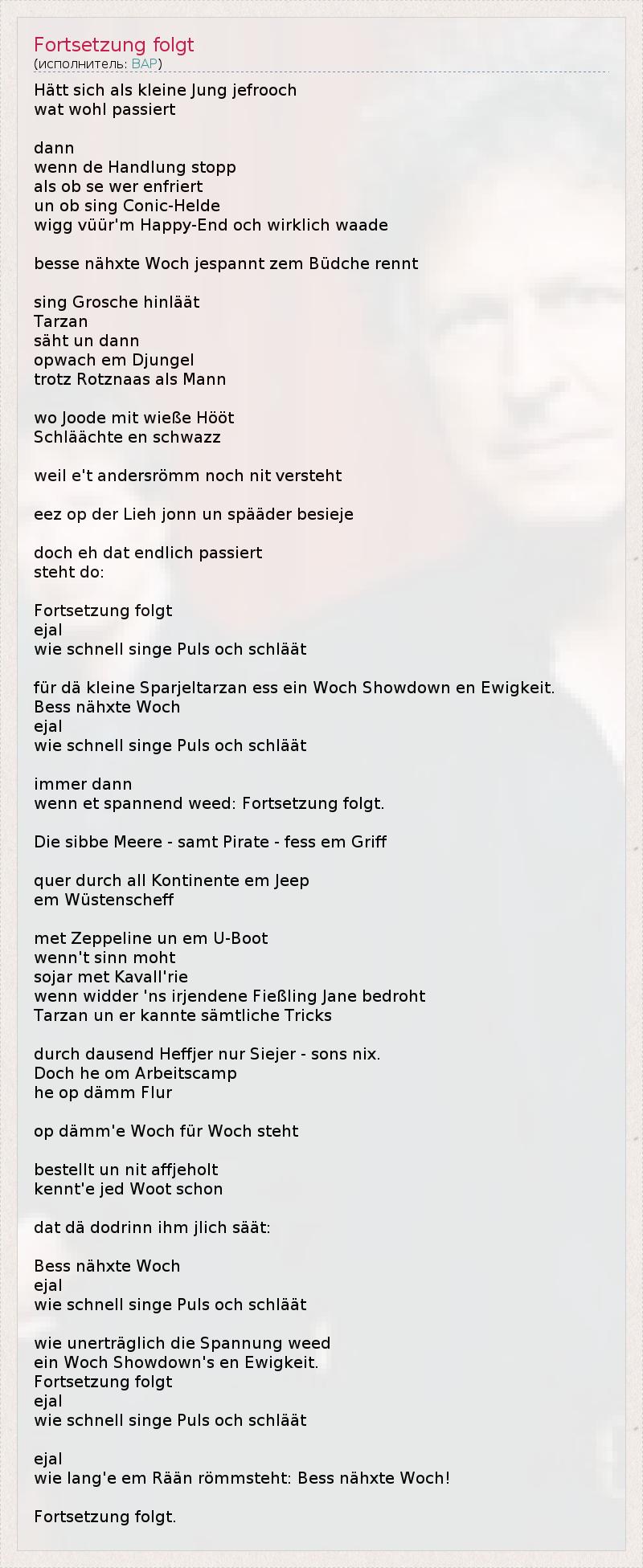 Hätt sich als kleine Jung jefrooch wat wohl passiert dann wenn de Handlung stopp als ob se wer enfriert un ob sing Conic-Helde wigg vüür'm Happy-End och wirklich waade besse nähxte Woch jespannt zem Büdche rennt sing Grosche hinläät Tarzan säht un dann opwach em Djungel trotz Rotznaas als Mann wo Joode mit wieße Hööt Schläächte en schwazz weil e't andersrömm noch nit versteht eez op der Lieh jonn un spääder besieje doch eh dat endlich passiert steht do: Fortsetzung folgt ejal wie schnell singe Puls och schläät für dä kleine Sparjeltarzan ess ein Woch Showdown en Ewigkeit. Bess nähxte Woch ejal wie schnell singe Puls och schläät immer dann wenn et spannend weed: Fortsetzung folgt. Die sibbe Meere - samt Pirate - fess em Griff quer durch all Kontinente em Jeep em Wüstenscheff met Zeppeline un em U-Boot wenn't sinn moht sojar met Kavall'rie wenn widder 'ns irjendene Fießling Jane bedroht Tarzan un er kannte sämtliche Tricks durch dausend Heffjer nur Siejer - sons nix. Doch he om Arbeitscamp he op dämm Flur op dämm'e Woch für Woch steht bestellt un nit affjeholt kennt'e jed Woot schon dat dä dodrinn ihm jlich säät: Bess nähxte Woch ejal wie schnell singe Puls och schläät wie unerträglich die Spannung weed ein Woch Showdown's en Ewigkeit. Fortsetzung folgt ejal wie schnell singe Puls och schläät ejal wie lang'e em Rään römmsteht: Bess nähxte Woch! Fortsetzung folgt.