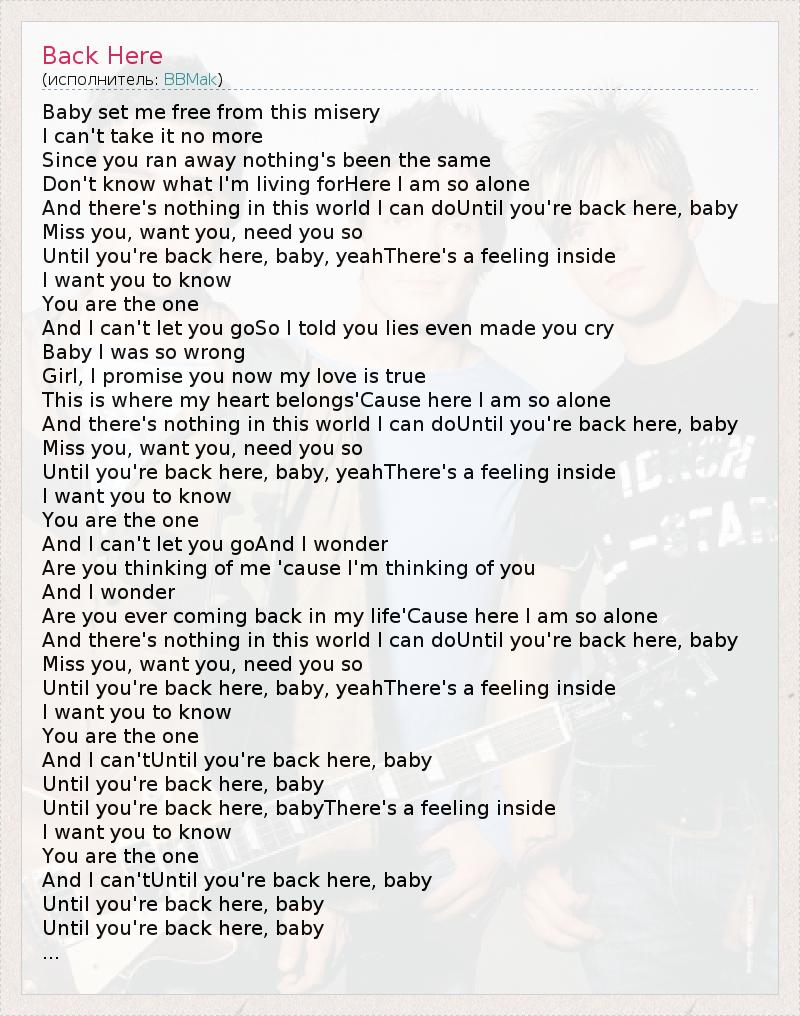 Baby set me free from this misery I can't take it no more Since you ran away nothing's been the same Don't know what I'm living forHere I am so alone And there's nothing in this world I can doUntil you're back here, baby Miss you, want you, need you so Until you're back here, baby, yeahThere's a feeling inside I want you to know You are the one And I can't let you goSo I told you lies even made you cry Baby I was so wrong Girl, I promise you now my love is true This is where my heart belongs'Cause here I am so alone And there's nothing in this world I can doUntil you're back here, baby Miss you, want you, need you so Until you're back here, baby, yeahThere's a feeling inside I want you to know You are the one And I can't let you goAnd I wonder Are you thinking of me 'cause I'm thinking of you And I wonder Are you ever coming back in my life'Cause here I am so alone And there's nothing in this world I can doUntil you're back here, baby Miss you, want you, need you so Until you're back here, baby, yeahThere's a feeling inside I want you to know You are the one And I can'tUntil you're back here, baby Until you're back here, baby Until you're back here, babyThere's a feeling inside I want you to know You are the one And I can'tUntil you're back here, baby Until you're back here, baby Until you're back here, baby ...