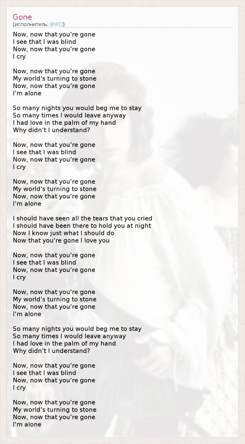 Now, now that you're gone I see that I was blind Now, now that you're gone I cry Now, now that you're gone My world's turning to stone Now, now that you're gone I'm alone So many nights you would beg me to stay So many times I would leave anyway I had love in the palm of my hand Why didn't I understand? Now, now that you're gone I see that I was blind Now, now that you're gone I cry Now, now that you're gone My world's turning to stone Now, now that you're gone I'm alone I should have seen all the tears that you cried I should have been there to hold you at night Now I know just what I should do Now that you're gone I love you Now, now that you're gone I see that I was blind Now, now that you're gone I cry Now, now that you're gone My world's turning to stone Now, now that you're gone I'm alone So many nights you would beg me to stay So many times I would leave anyway I had love in the palm of my hand Why didn't I understand? Now, now that you're gone I see that I was blind Now, now that you're gone I cry Now, now that you're gone My world's turning to stone Now, now that you're gone I'm alone