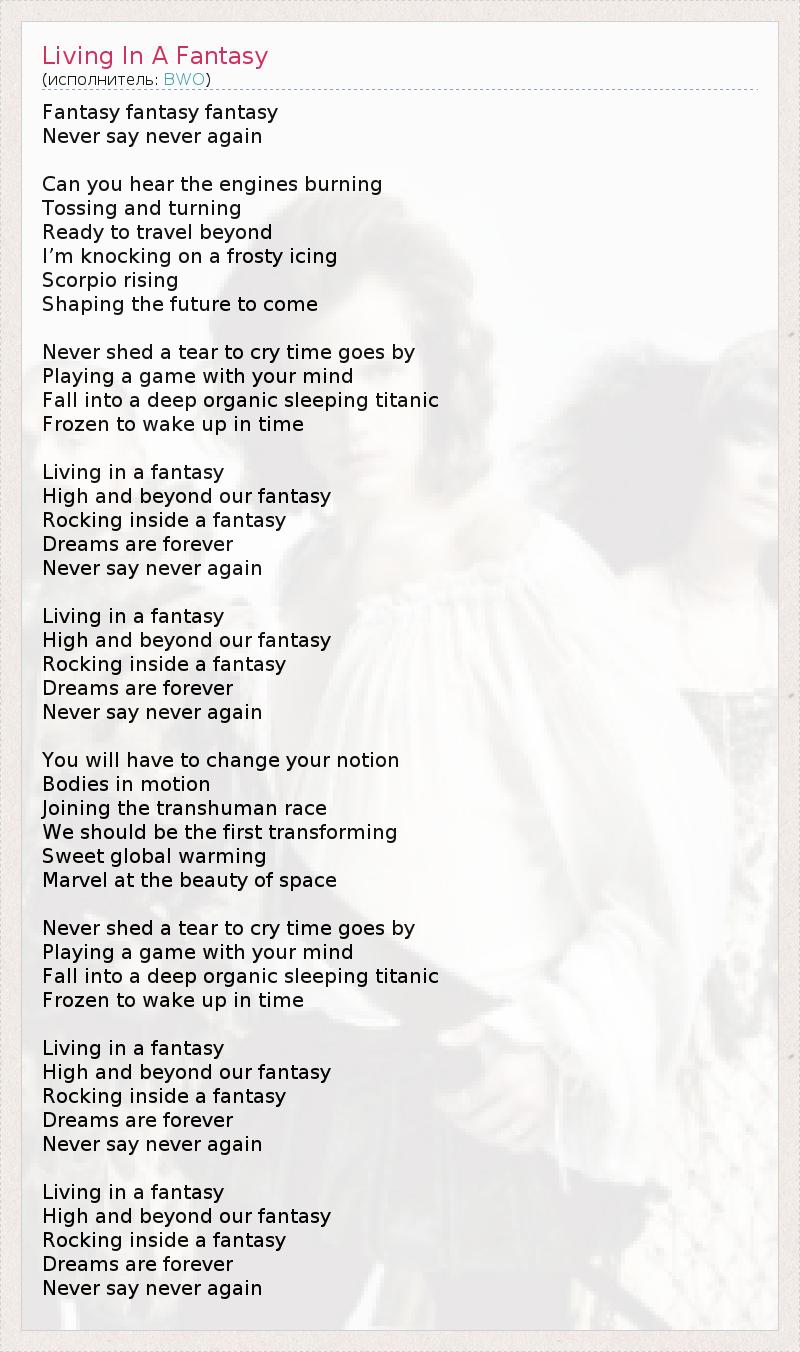 Fantasy fantasy fantasy Never say never again Can you hear the engines burning Tossing and turning Ready to travel beyond I’m knocking on a frosty icing Scorpio rising Shaping the future to come Never shed a tear to cry time goes by Playing a game with your mind Fall into a deep organic sleeping titanic Frozen to wake up in time Living in a fantasy High and beyond our fantasy Rocking inside a fantasy Dreams are forever Never say never again Living in a fantasy High and beyond our fantasy Rocking inside a fantasy Dreams are forever Never say never again You will have to change your notion Bodies in motion Joining the transhuman race We should be the first transforming Sweet global warming Marvel at the beauty of space Never shed a tear to cry time goes by Playing a game with your mind Fall into a deep organic sleeping titanic Frozen to wake up in time Living in a fantasy High and beyond our fantasy Rocking inside a fantasy Dreams are forever Never say never again Living in a fantasy High and beyond our fantasy Rocking inside a fantasy Dreams are forever Never say never again