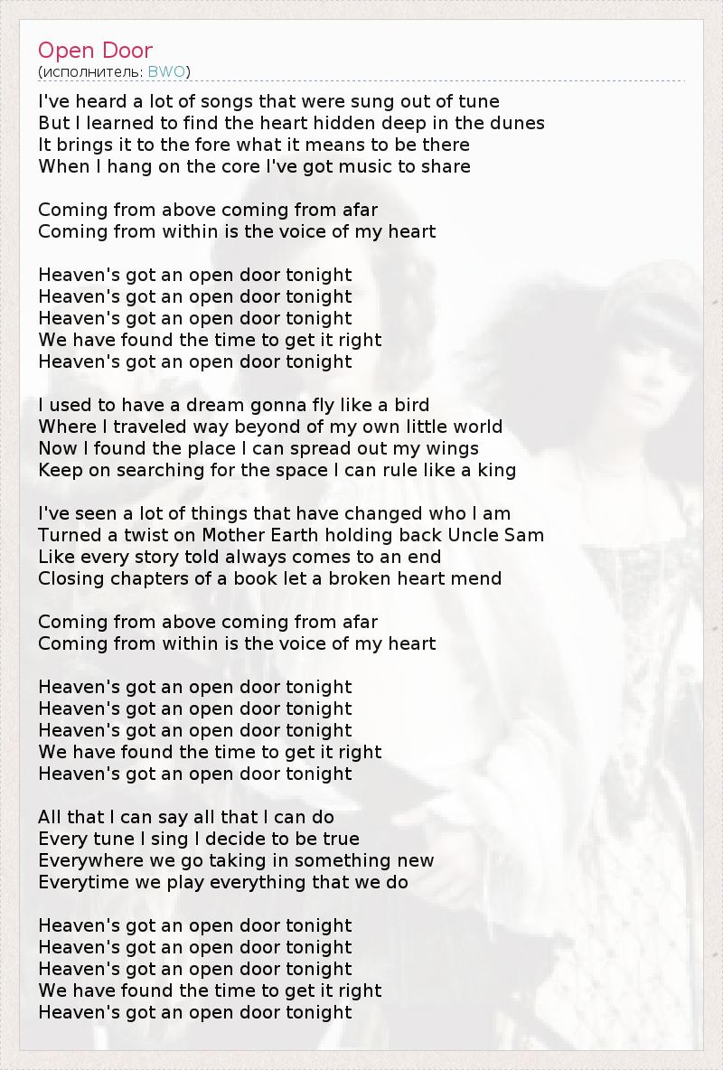 I've heard a lot of songs that were sung out of tune But I learned to find the heart hidden deep in the dunes It brings it to the fore what it means to be there When I hang on the core I've got music to share Coming from above coming from afar Coming from within is the voice of my heart Heaven's got an open door tonight Heaven's got an open door tonight Heaven's got an open door tonight We have found the time to get it right Heaven's got an open door tonight I used to have a dream gonna fly like a bird Where I traveled way beyond of my own little world Now I found the place I can spread out my wings Keep on searching for the space I can rule like a king I've seen a lot of things that have changed who I am Turned a twist on Mother Earth holding back Uncle Sam Like every story told always comes to an end Closing chapters of a book let a broken heart mend Coming from above coming from afar Coming from within is the voice of my heart Heaven's got an open door tonight Heaven's got an open door tonight Heaven's got an open door tonight We have found the time to get it right Heaven's got an open door tonight All that I can say all that I can do Every tune I sing I decide to be true Everywhere we go taking in something new Everytime we play everything that we do Heaven's got an open door tonight Heaven's got an open door tonight Heaven's got an open door tonight We have found the time to get it right Heaven's got an open door tonight