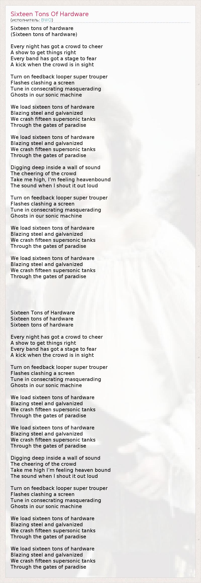 Sixteen tons of hardware (Sixteen tons of hardware) Every night has got a crowd to cheer A show to get things right Every band has got a stage to fear A kick when the crowd is in sight Turn on feedback looper super trouper Flashes clashing a screen Tune in consecrating masquerading Ghosts in our sonic machine We load sixteen tons of hardware Blazing steel and galvanized We crash fifteen supersonic tanks Through the gates of paradise We load sixteen tons of hardware Blazing steel and galvanized We crash fifteen supersonic tanks Through the gates of paradise Digging deep inside a wall of sound The cheering of the crowd Take me high, I'm feeling heavenbound The sound when I shout it out loud Turn on feedback looper super trouper Flashes clashing a screen Tune in consecrating masquerading Ghosts in our sonic machine We load sixteen tons of hardware Blazing steel and galvanized We crash fifteen supersonic tanks Through the gates of paradise We load sixteen tons of hardware Blazing steel and galvanized We crash fifteen supersonic tanks Through the gates of paradise Sixteen Tons of Hardware Sixteen tons of hardware Sixteen tons of hardware Every night has got a crowd to cheer A show to get things right Every band has got a stage to fear A kick when the crowd is in sight Turn on feedback looper super trouper Flashes clashing a screen Tune in consecrating masquerading Ghosts in our sonic machine We load sixteen tons of hardware Blazing steel and galvanized We crash fifteen supersonic tanks Through the gates of paradise We load sixteen tons of hardware Blazing steel and galvanized We crash fifteen supersonic tanks Through the gates of paradise Digging deep inside a wall of sound The cheering of the crowd Take me high I’m feeling heaven bound The sound when I shout it out loud Turn on feedback looper super trouper Flashes clashing a screen Tune in consecrating masquerading Ghosts in our sonic machine We load sixteen tons of hardware Blazing steel and galvanized We crash fifteen supersonic tanks Through the gates of paradise We load sixteen tons of hardware Blazing steel and galvanized We crash fifteen supersonic tanks Through the gates of paradise