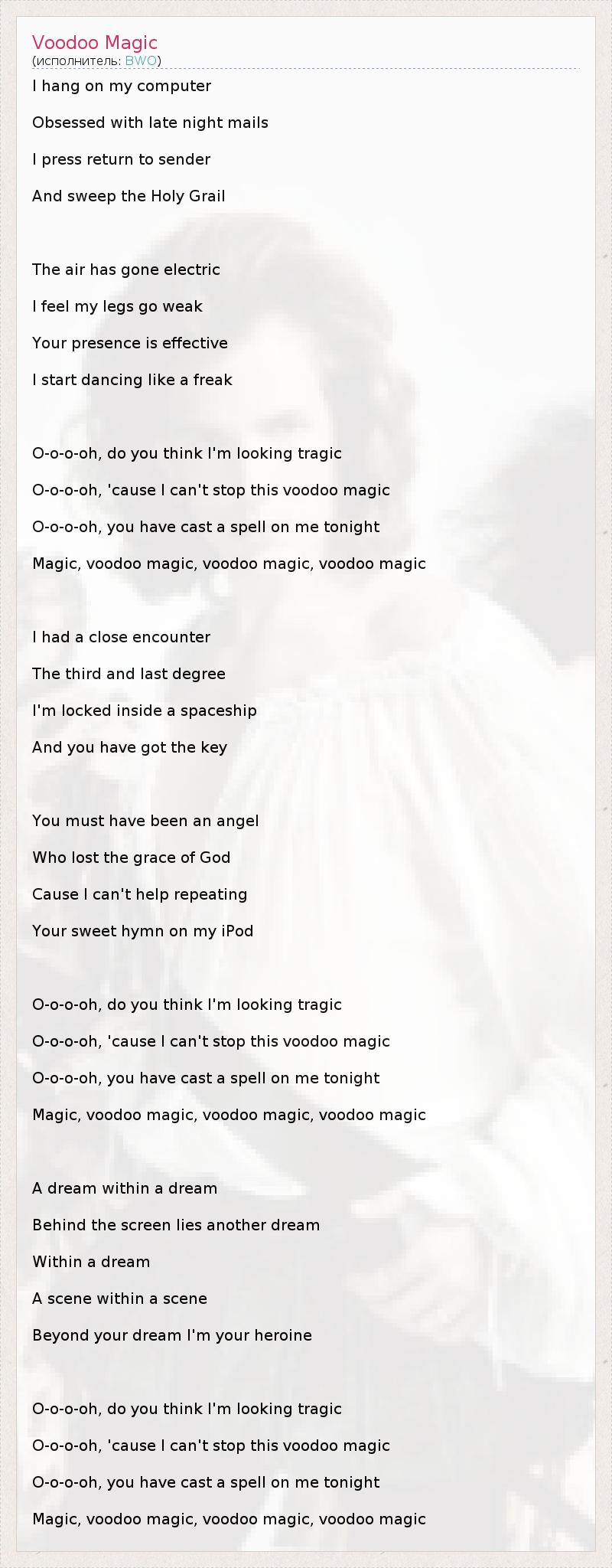 I hang on my computer Obsessed with late night mails I press return to sender And sweep the Holy Grail The air has gone electric I feel my legs go weak Your presence is effective I start dancing like a freak O-o-o-oh, do you think I'm looking tragic O-o-o-oh, 'cause I can't stop this voodoo magic O-o-o-oh, you have cast a spell on me tonight Magic, voodoo magic, voodoo magic, voodoo magic I had a close encounter The third and last degree I'm locked inside a spaceship And you have got the key You must have been an angel Who lost the grace of God Cause I can't help repeating Your sweet hymn on my iPod O-o-o-oh, do you think I'm looking tragic O-o-o-oh, 'cause I can't stop this voodoo magic O-o-o-oh, you have cast a spell on me tonight Magic, voodoo magic, voodoo magic, voodoo magic A dream within a dream Behind the screen lies another dream Within a dream A scene within a scene Beyond your dream I'm your heroine O-o-o-oh, do you think I'm looking tragic O-o-o-oh, 'cause I can't stop this voodoo magic O-o-o-oh, you have cast a spell on me tonight Magic, voodoo magic, voodoo magic, voodoo magic