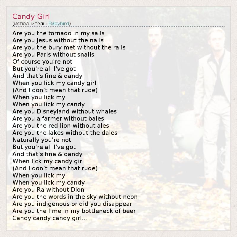 Are you the tornado in my sails Are you Jesus without the nails Are you the bury met without the rails Are you Paris without snails Of course you're not But you're all I've got And that's fine & dandy When you lick my candy girl (And I don't mean that rude) When you lick my When you lick my candy Are you Disneyland without whales Are you a farmer without bales Are you the red lion without ales Are you the lakes without the dales Naturally you're not But you're all I've got And that's fine & dandy When lick my candy girl (And I don't mean that rude) When you lick my When you lick my candy Are you Ra without Dion Are you the words in the sky without neon Are you indigenous or did you disappear Are you the lime in my bottleneck of beer Candy candy candy girl...