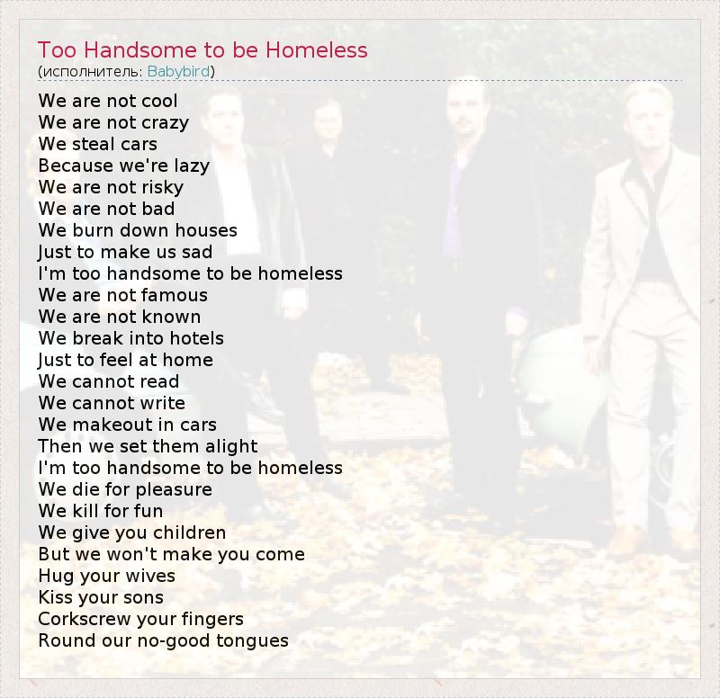 А как ты думаешь, о чем песня "Too Handsome to be Homeless" ?
