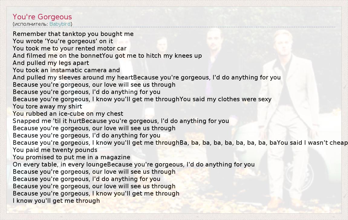 Remember that tanktop you bought me You wrote 'You're gorgeous' on it You took me to your rented motor car And filmed me on the bonnetYou got me to hitch my knees up And pulled my legs apart You took an instamatic camera and And pulled my sleeves around my heartBecause you're gorgeous, I'd do anything for you Because you're gorgeous, our love will see us through Because you're gorgeous, I'd do anything for you Because you're gorgeous, I know you'll get me throughYou said my clothes were sexy You tore away my shirt You rubbed an ice-cube on my chest Snapped me 'til it hurtBecause you're gorgeous, I'd do anything for you Because you're gorgeous, our love will see us through Because you're gorgeous, I'd do anything for you Because you're gorgeous, I know you'll get me throughBa, ba, ba, ba, ba, ba, ba, ba, baYou said I wasn't cheap You paid me twenty pounds You promised to put me in a magazine On every table, in every loungeBecause you're gorgeous, I'd do anything for you Because you're gorgeous, our love will see us through Because you're gorgeous, I'd do anything for you Because you're gorgeous, our love will see us through Because you're gorgeous, I know you'll get me through I know you'll get me through