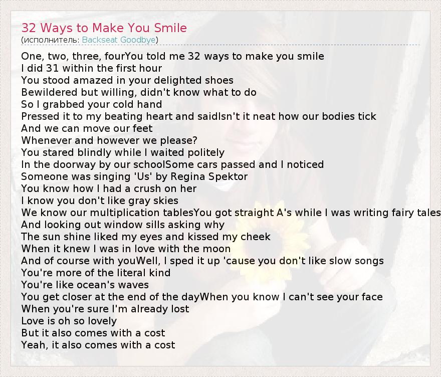 А как ты думаешь, о чем песня "32 Ways to Make You Smile" ?