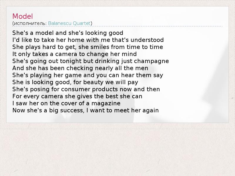 She's a model and she's looking good I'd like to take her home with me that's understood She plays hard to get, she smiles from time to time It only takes a camera to change her mind She's going out tonight but drinking just champagne And she has been checking nearly all the men She's playing her game and you can hear them say She is looking good, for beauty we will pay She's posing for consumer products now and then For every camera she gives the best she can I saw her on the cover of a magazine Now she's a big success, I want to meet her again