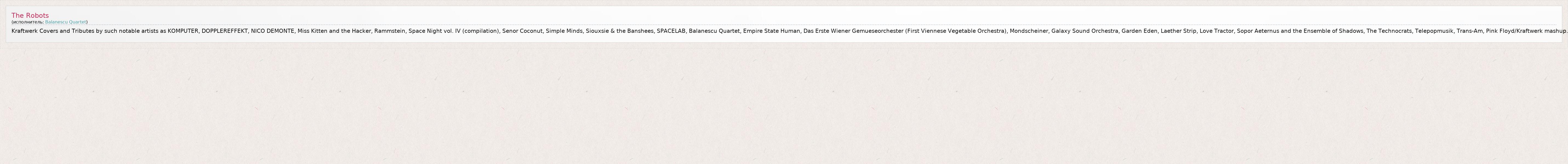 Kraftwerk Covers and Tributes by such notable artists as KOMPUTER, DOPPLEREFFEKT, NICO DEMONTE, Miss Kitten and the Hacker, Rammstein, Space Night vol. IV (compilation), Senor Coconut, Simple Minds, Siouxsie & the Banshees, SPACELAB, Balanescu Quartet, Empire State Human, Das Erste Wiener Gemueseorchester (First Viennese Vegetable Orchestra), Mondscheiner, Galaxy Sound Orchestra, Garden Eden, Laether Strip, Love Tractor, Sopor Aeternus and the Ensemble of Shadows, The Technocrats, Telepopmusik, Trans-Am, Pink Floyd/Kraftwerk mashup.