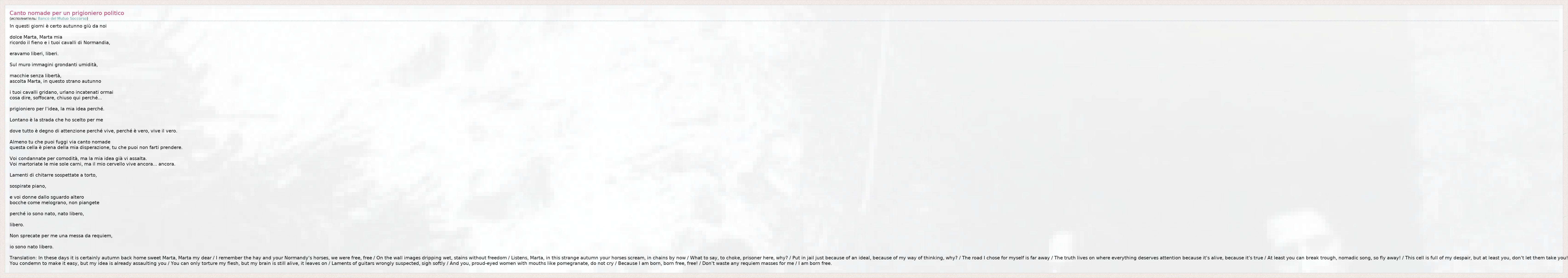 Translation: In these days it is certainly autumn back home sweet Marta, Marta my dear / I remember the hay and your Normandy's horses, we were free, free / On the wall images dripping wet, stains without freedom / Listens, Marta, in this strange autumn your horses scream, in chains by now / What to say, to choke, prisoner here, why? / Put in jail just because of an ideal, because of my way of thinking, why? / The road I chose for myself is far away / The truth lives on where everything deserves attention because it's alive, because it's true / At least you can break trough, nomadic song, so fly away! / This cell is full of my despair, but at least you, don't let them take you!