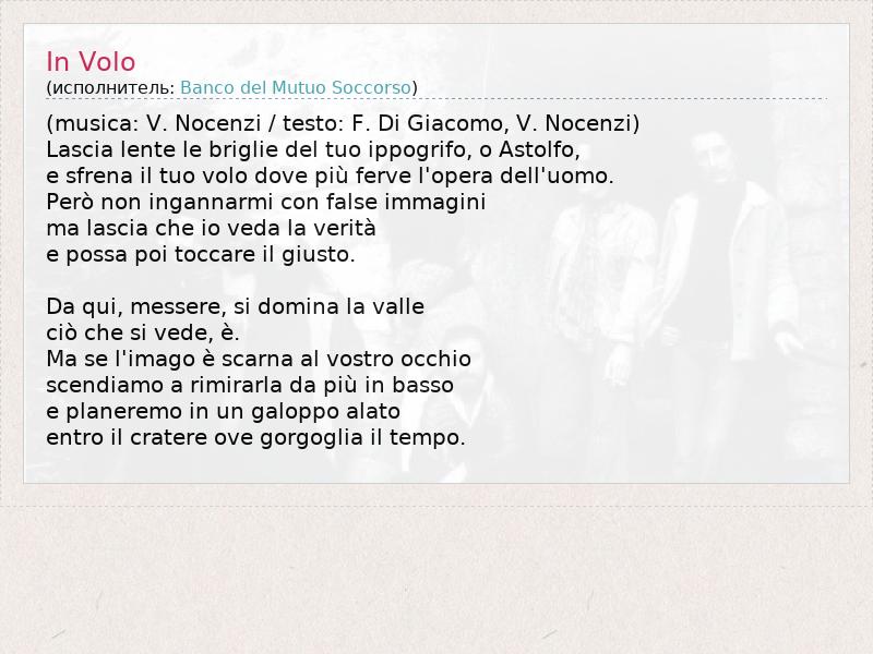 Это интересно:Этот один из наиболее значимых итальянских проговых коллективов существует и поныне, его классические работы по праву входят в число лучших пластинок итальянского арт-рока, да, пожалуй, и всей рок-музыки в целом. А начинала группа еще в 1968 году, когда братья Vittorio Nocenzi (клавишные) и Gianni Nocenzi (клавишные) совместно с Franco Coletta (гитара), Fabrizio Falco (bass) и Mario Achilli (ударные) обосновались в Риме, где у братьев... продолжение