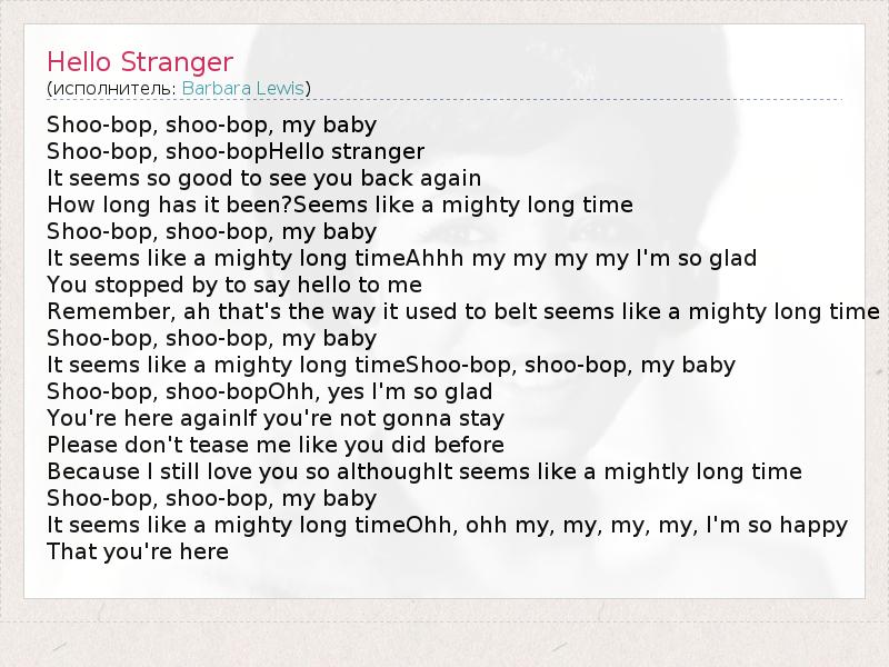 Shoo-bop, shoo-bop, my baby Shoo-bop, shoo-bopHello stranger It seems so good to see you back again How long has it been?Seems like a mighty long time Shoo-bop, shoo-bop, my baby It seems like a mighty long timeAhhh my my my my I'm so glad You stopped by to say hello to me Remember, ah that's the way it used to beIt seems like a mighty long time Shoo-bop, shoo-bop, my baby It seems like a mighty long timeShoo-bop, shoo-bop, my baby Shoo-bop, shoo-bopOhh, yes I'm so glad You're here againIf you're not gonna stay Please don't tease me like you did before Because I still love you so althoughIt seems like a mightly long time Shoo-bop, shoo-bop, my baby It seems like a mighty long timeOhh, ohh my, my, my, my, I'm so happy That you're here