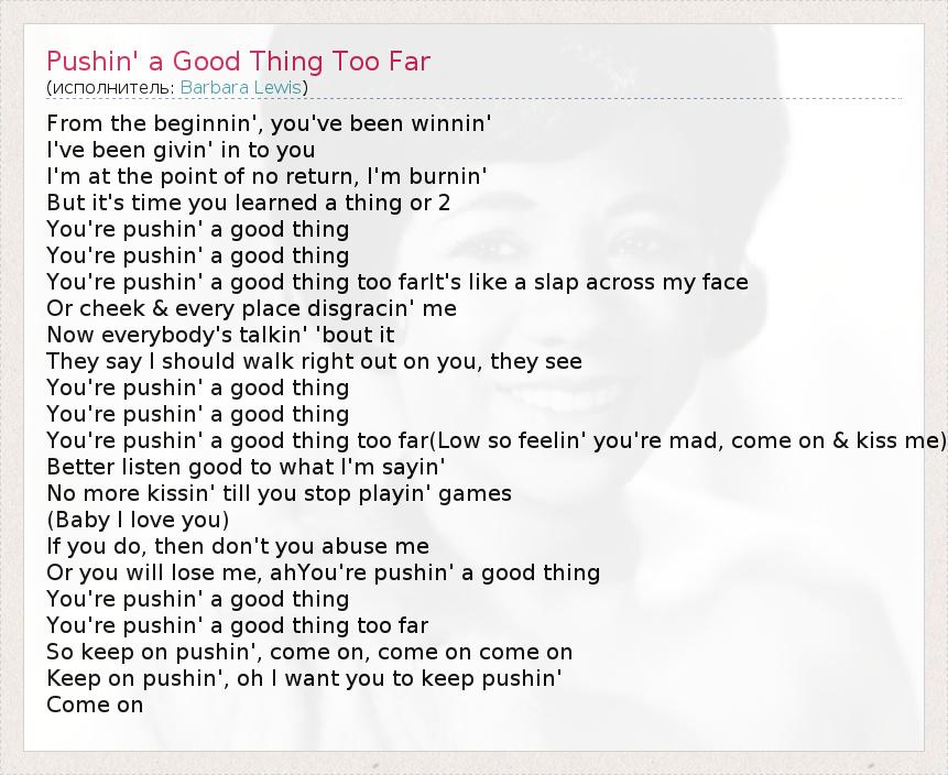 From the beginnin', you've been winnin' I've been givin' in to you I'm at the point of no return, I'm burnin' But it's time you learned a thing or 2 You're pushin' a good thing You're pushin' a good thing You're pushin' a good thing too farIt's like a slap across my face Or cheek & every place disgracin' me Now everybody's talkin' 'bout it They say I should walk right out on you, they see You're pushin' a good thing You're pushin' a good thing You're pushin' a good thing too far(Low so feelin' you're mad, come on & kiss me) Better listen good to what I'm sayin' No more kissin' till you stop playin' games (Baby I love you) If you do, then don't you abuse me Or you will lose me, ahYou're pushin' a good thing You're pushin' a good thing You're pushin' a good thing too far So keep on pushin', come on, come on come on Keep on pushin', oh I want you to keep pushin' Come on