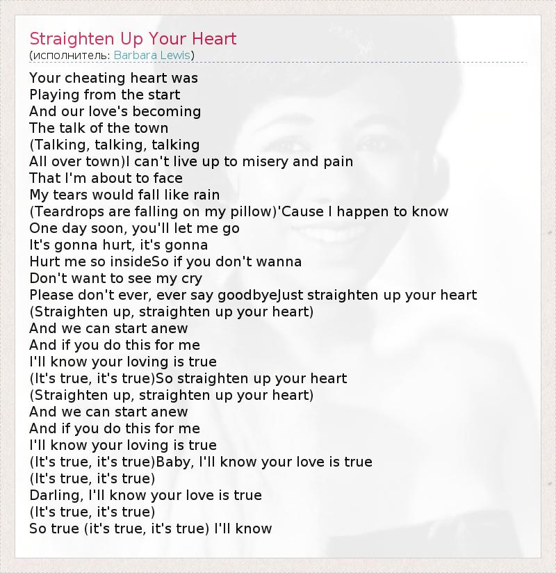Your cheating heart was Playing from the start And our love's becoming The talk of the town (Talking, talking, talking All over town)I can't live up to misery and pain That I'm about to face My tears would fall like rain (Teardrops are falling on my pillow)'Cause I happen to know One day soon, you'll let me go It's gonna hurt, it's gonna Hurt me so insideSo if you don't wanna Don't want to see my cry Please don't ever, ever say goodbyeJust straighten up your heart (Straighten up, straighten up your heart) And we can start anew And if you do this for me I'll know your loving is true (It's true, it's true)So straighten up your heart (Straighten up, straighten up your heart) And we can start anew And if you do this for me I'll know your loving is true (It's true, it's true)Baby, I'll know your love is true (It's true, it's true) Darling, I'll know your love is true (It's true, it's true) So true (it's true, it's true) I'll know
