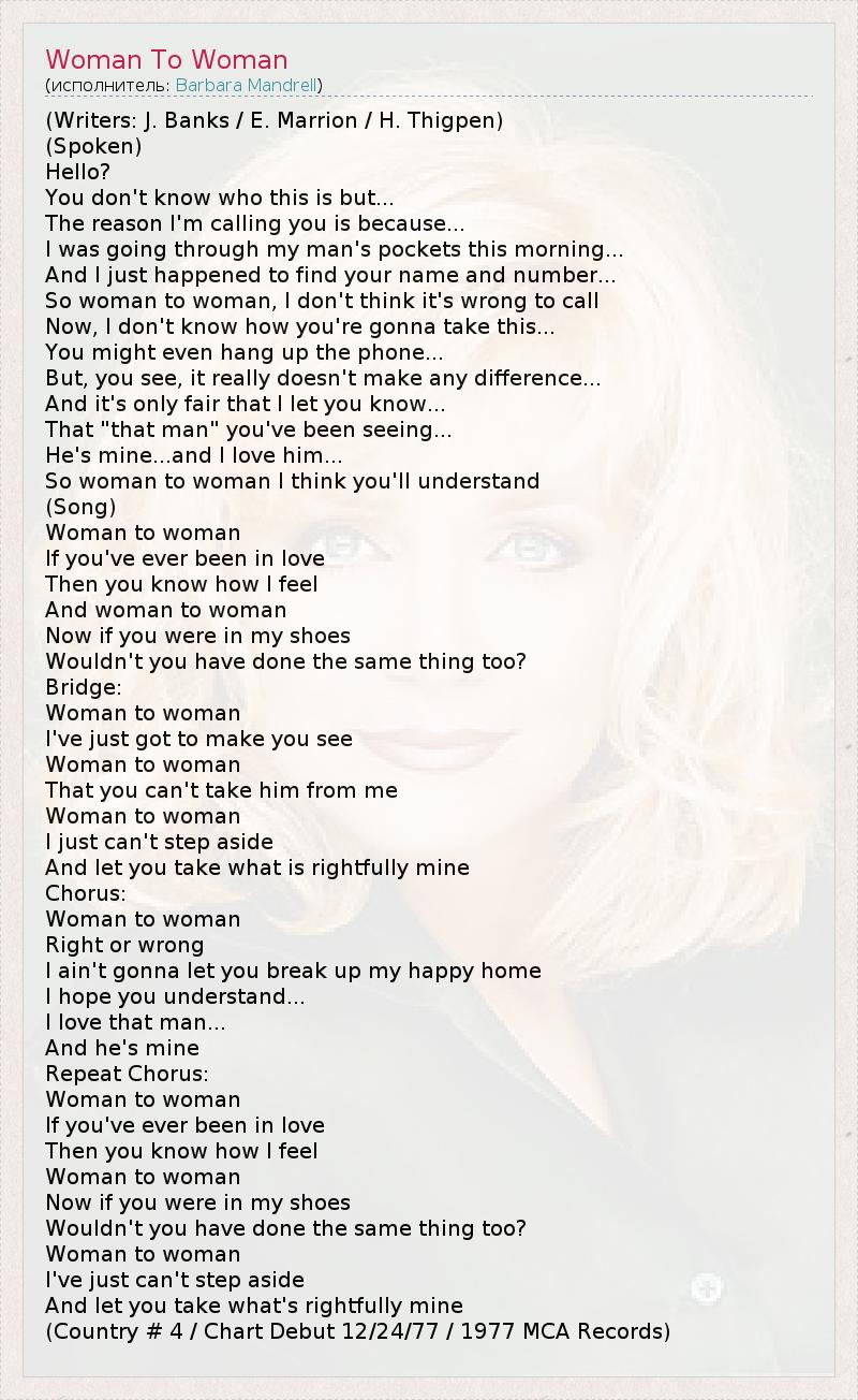 А как ты думаешь, о чем песня "Woman To Woman" ?