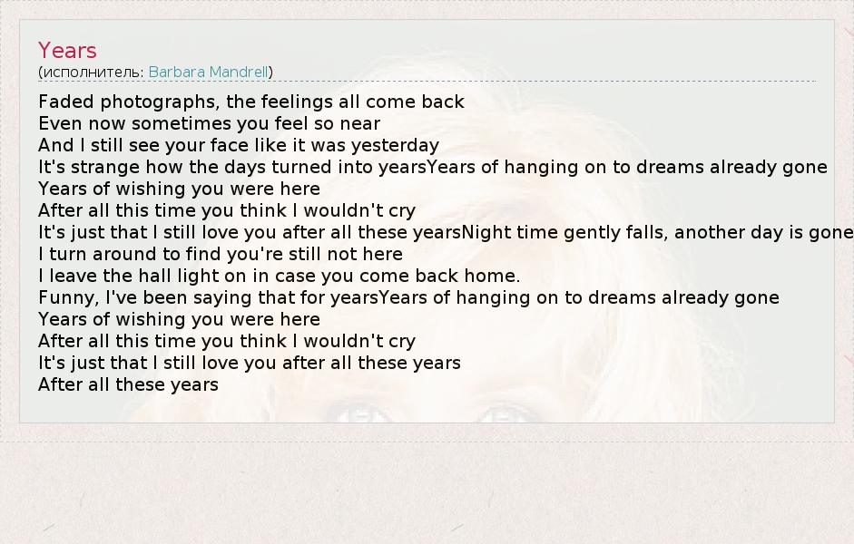 Faded photographs, the feelings all come back Even now sometimes you feel so near And I still see your face like it was yesterday It's strange how the days turned into yearsYears of hanging on to dreams already gone Years of wishing you were here After all this time you think I wouldn't cry It's just that I still love you after all these yearsNight time gently falls, another day is gone I turn around to find you're still not here I leave the hall light on in case you come back home. Funny, I've been saying that for yearsYears of hanging on to dreams already gone Years of wishing you were here After all this time you think I wouldn't cry It's just that I still love you after all these years After all these years