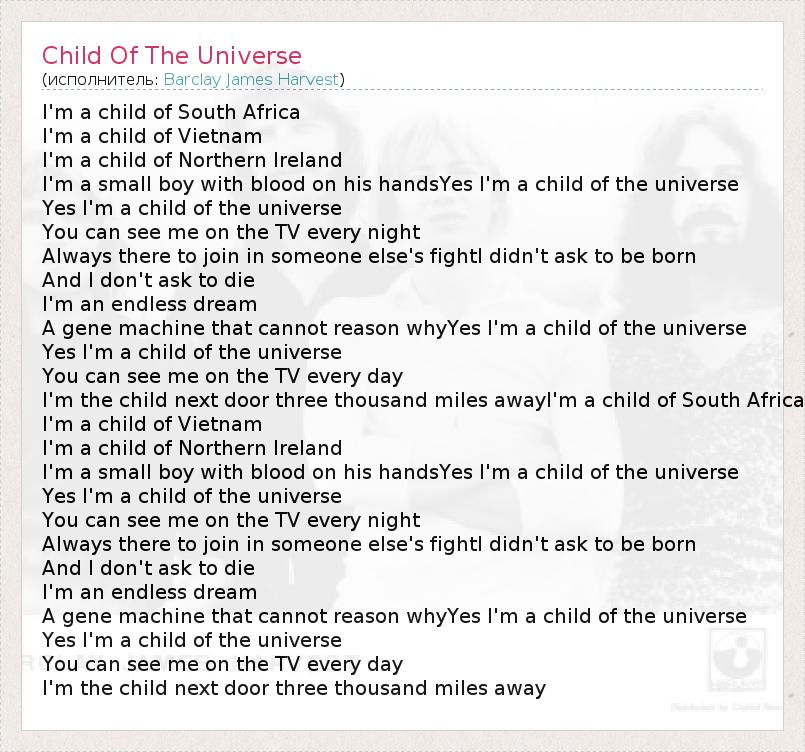 I'm a child of South Africa I'm a child of Vietnam I'm a child of Northern Ireland I'm a small boy with blood on his handsYes I'm a child of the universe Yes I'm a child of the universe You can see me on the TV every night Always there to join in someone else's fightI didn't ask to be born And I don't ask to die I'm an endless dream A gene machine that cannot reason whyYes I'm a child of the universe Yes I'm a child of the universe You can see me on the TV every day I'm the child next door three thousand miles awayI'm a child of South Africa I'm a child of Vietnam I'm a child of Northern Ireland I'm a small boy with blood on his handsYes I'm a child of the universe Yes I'm a child of the universe You can see me on the TV every night Always there to join in someone else's fightI didn't ask to be born And I don't ask to die I'm an endless dream A gene machine that cannot reason whyYes I'm a child of the universe Yes I'm a child of the universe You can see me on the TV every day I'm the child next door three thousand miles away