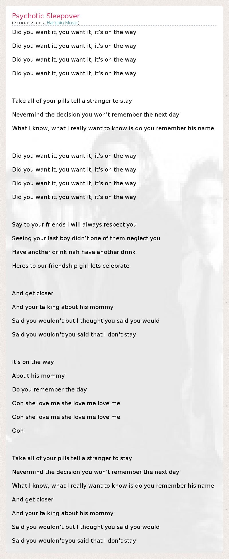 Did you want it, you want it, it's on the way Did you want it, you want it, it's on the way Did you want it, you want it, it's on the way Did you want it, you want it, it's on the way Take all of your pills tell a stranger to stay Nevermind the decision you won't remember the next day What I know, what I really want to know is do you remember his name Did you want it, you want it, it's on the way Did you want it, you want it, it's on the way Did you want it, you want it, it's on the way Did you want it, you want it, it's on the way Say to your friends I will always respect you Seeing your last boy didn't one of them neglect you Have another drink nah have another drink Heres to our friendship girl lets celebrate And get closer And your talking about his mommy Said you wouldn't but I thought you said you would Said you wouldn't you said that I don't stay It's on the way About his mommy Do you remember the day Ooh she love me she love me love me Ooh she love me she love me love me Ooh Take all of your pills tell a stranger to stay Nevermind the decision you won't remember the next day What I know, what I really want to know is do you remember his name And get closer And your talking about his mommy Said you wouldn't but I thought you said you would Said you wouldn't you said that I don't stay