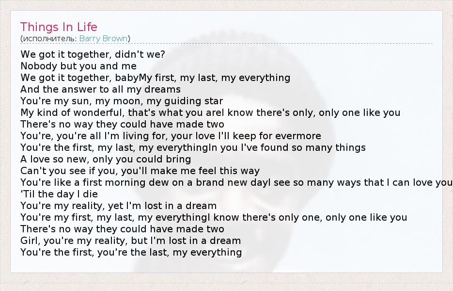 We got it together, didn't we? Nobody but you and me We got it together, babyMy first, my last, my everything And the answer to all my dreams You're my sun, my moon, my guiding star My kind of wonderful, that's what you areI know there's only, only one like you There's no way they could have made two You're, you're all I'm living for, your love I'll keep for evermore You're the first, my last, my everythingIn you I've found so many things A love so new, only you could bring Can't you see if you, you'll make me feel this way You're like a first morning dew on a brand new dayI see so many ways that I can love you 'Til the day I die You're my reality, yet I'm lost in a dream You're my first, my last, my everythingI know there's only one, only one like you There's no way they could have made two Girl, you're my reality, but I'm lost in a dream You're the first, you're the last, my everything