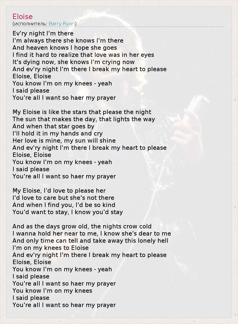 Ev'ry night I'm there I'm always there she knows I'm there And heaven knows I hope she goes I find it hard to realize that love was in her eyes It's dying now, she knows I'm crying now And ev'ry night I'm there I break my heart to please Eloise, Eloise You know I'm on my knees - yeah I said please You're all I want so haer my prayer My Eloise is like the stars that please the night The sun that makes the day, that lights the way And when that star goes by I'll hold it in my hands and cry Her love is mine, my sun will shine And ev'ry night I'm there I break my heart to please Eloise, Eloise You know I'm on my knees - yeah I said please You're all I want so haer my prayer My Eloise, I'd love to please her I'd love to care but she's not there And when I find you, I'd be so kind You'd want to stay, I know you'd stay And as the days grow old, the nights crow cold I wanna hold her near to me, I know she's dear to me And only time can tell and take away this lonely hell I'm on my knees to Eloise And ev'ry night I'm there I break my heart to please Eloise, Eloise You know I'm on my knees - yeah I said please You're all I want so haer my prayer You know I'm on my knees I said please You're all I want so hear my prayer