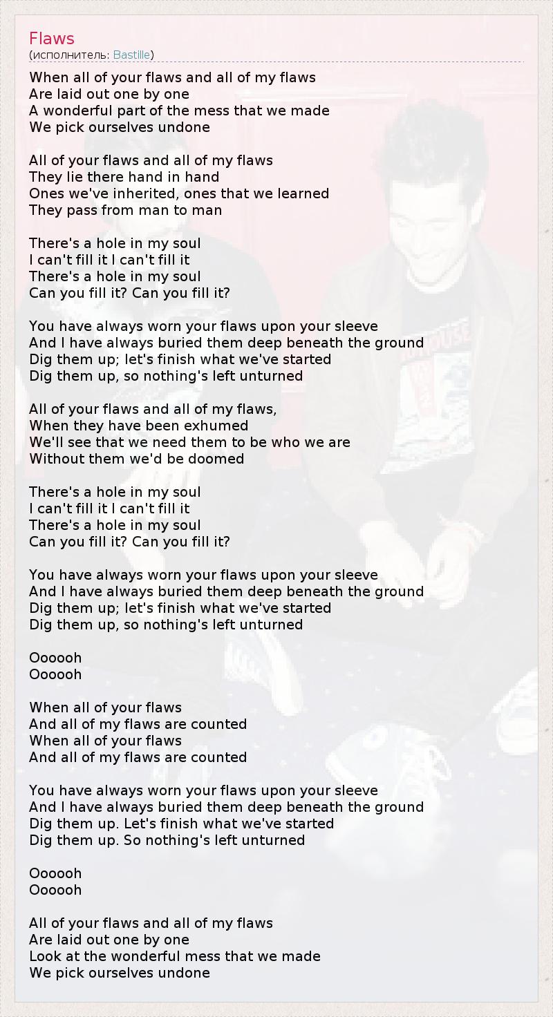 When all of your flaws and all of my flaws Are laid out one by one A wonderful part of the mess that we made We pick ourselves undone All of your flaws and all of my flaws They lie there hand in hand Ones we've inherited, ones that we learned They pass from man to man There's a hole in my soul I can't fill it I can't fill it There's a hole in my soul Can you fill it? Can you fill it? You have always worn your flaws upon your sleeve And I have always buried them deep beneath the ground Dig them up; let's finish what we've started Dig them up, so nothing's left unturned All of your flaws and all of my flaws, When they have been exhumed We'll see that we need them to be who we are Without them we'd be doomed There's a hole in my soul I can't fill it I can't fill it There's a hole in my soul Can you fill it? Can you fill it? You have always worn your flaws upon your sleeve And I have always buried them deep beneath the ground Dig them up; let's finish what we've started Dig them up, so nothing's left unturned Oooooh Oooooh When all of your flaws And all of my flaws are counted When all of your flaws And all of my flaws are counted You have always worn your flaws upon your sleeve And I have always buried them deep beneath the ground Dig them up. Let's finish what we've started Dig them up. So nothing's left unturned Oooooh Oooooh All of your flaws and all of my flaws Are laid out one by one Look at the wonderful mess that we made We pick ourselves undone