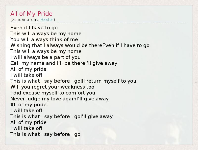 Even if I have to go This will always be my home You will always think of me Wishing that I always would be thereEven if I have to go This will always be my home I will always be a part of you Call my name and I'll be thereI'll give away All of my pride I will take off This is what I say before I goIll return myself to you Will you regret your weakness too I did excuse myself to comfort you Never judge my love againI'll give away All of my pride I will take off This is what I say before I goI'll give away All of my pride I will take off This is what I say before I go