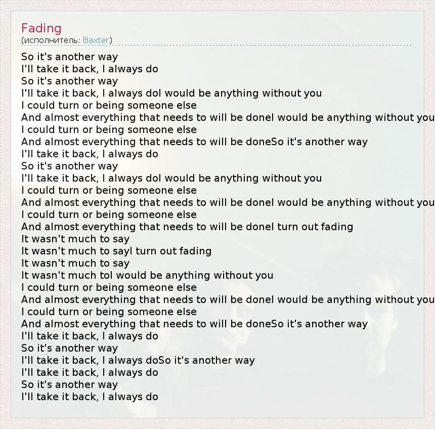 So it's another way I'll take it back, I always do So it's another way I'll take it back, I always doI would be anything without you I could turn or being someone else And almost everything that needs to will be doneI would be anything without you I could turn or being someone else And almost everything that needs to will be doneSo it's another way I'll take it back, I always do So it's another way I'll take it back, I always doI would be anything without you I could turn or being someone else And almost everything that needs to will be doneI would be anything without you I could turn or being someone else And almost everything that needs to will be doneI turn out fading It wasn't much to say It wasn't much to sayI turn out fading It wasn't much to say It wasn't much toI would be anything without you I could turn or being someone else And almost everything that needs to will be doneI would be anything without you I could turn or being someone else And almost everything that needs to will be doneSo it's another way I'll take it back, I always do So it's another way I'll take it back, I always doSo it's another way I'll take it back, I always do So it's another way I'll take it back, I always do