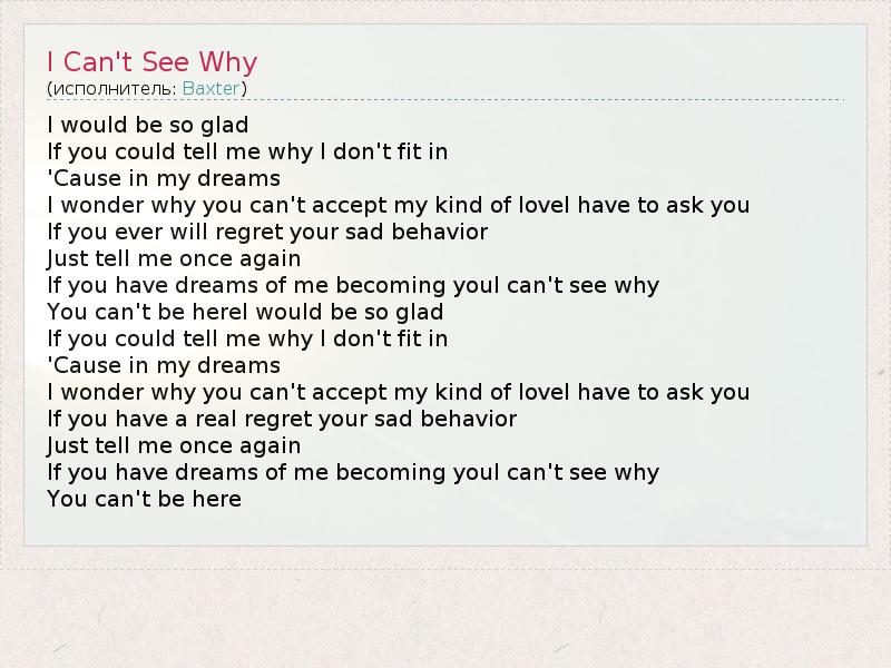 I would be so glad If you could tell me why I don't fit in 'Cause in my dreams I wonder why you can't accept my kind of loveI have to ask you If you ever will regret your sad behavior Just tell me once again If you have dreams of me becoming youI can't see why You can't be hereI would be so glad If you could tell me why I don't fit in 'Cause in my dreams I wonder why you can't accept my kind of loveI have to ask you If you have a real regret your sad behavior Just tell me once again If you have dreams of me becoming youI can't see why You can't be here