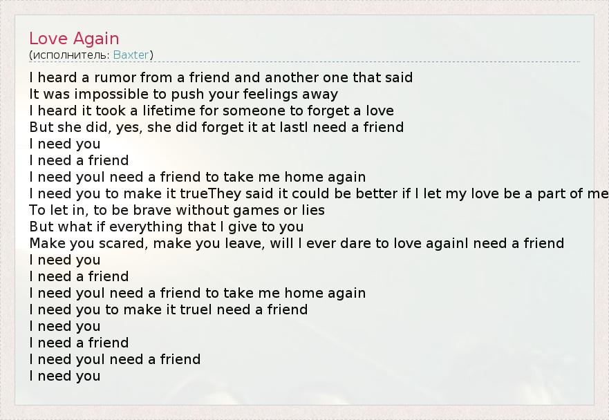 I heard a rumor from a friend and another one that said It was impossible to push your feelings away I heard it took a lifetime for someone to forget a love But she did, yes, she did forget it at lastI need a friend I need you I need a friend I need youI need a friend to take me home again I need you to make it trueThey said it could be better if I let my love be a part of me To let in, to be brave without games or lies But what if everything that I give to you Make you scared, make you leave, will I ever dare to love againI need a friend I need you I need a friend I need youI need a friend to take me home again I need you to make it trueI need a friend I need you I need a friend I need youI need a friend I need you