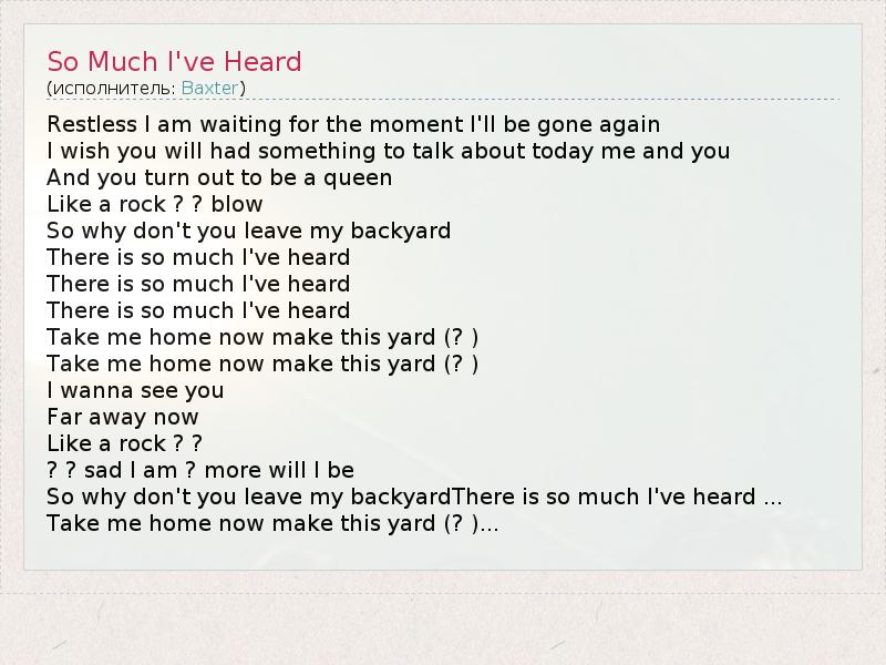 Restless I am waiting for the moment I'll be gone again I wish you will had something to talk about today me and you And you turn out to be a queen Like a rock ? ? blow So why don't you leave my backyard There is so much I've heard There is so much I've heard There is so much I've heard Take me home now make this yard (? ) Take me home now make this yard (? ) I wanna see you Far away now Like a rock ? ? ? ? sad I am ? more will I be So why don't you leave my backyardThere is so much I've heard ... Take me home now make this yard (? )...
