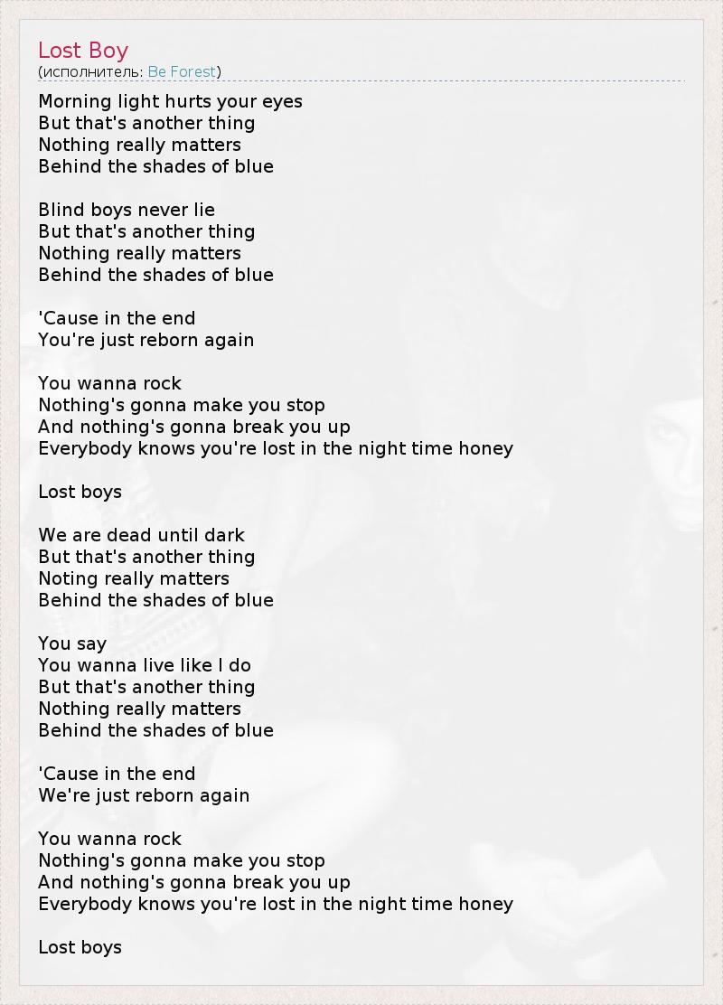 Morning light hurts your eyes But that's another thing Nothing really matters Behind the shades of blue Blind boys never lie But that's another thing Nothing really matters Behind the shades of blue 'Cause in the end You're just reborn again You wanna rock Nothing's gonna make you stop And nothing's gonna break you up Everybody knows you're lost in the night time honey Lost boys We are dead until dark But that's another thing Noting really matters Behind the shades of blue You say You wanna live like I do But that's another thing Nothing really matters Behind the shades of blue 'Cause in the end We're just reborn again You wanna rock Nothing's gonna make you stop And nothing's gonna break you up Everybody knows you're lost in the night time honey Lost boys