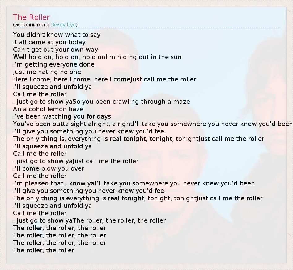 You didn't know what to say It all came at you today Can't get out your own way Well hold on, hold on, hold onI'm hiding out in the sun I'm getting everyone done Just me hating no one Here I come, here I come, here I comeJust call me the roller I'll squeeze and unfold ya Call me the roller I just go to show yaSo you been crawling through a maze An alcohol lemon haze I've been watching you for days You've been outta sight alright, alrightI'll take you somewhere you never knew you'd been I'll give you something you never knew you'd feel The only thing is, everything is real tonight, tonight, tonightJust call me the roller I'll squeeze and unfold ya Call me the roller I just go to show yaJust call me the roller I'll come blow you over Call me the roller I'm pleased that I know yaI'll take you somewhere you never knew you'd been I'll give you something you never knew you'd feel The only thing is everything is real tonight, tonight, tonightJust call me the roller I'll squeeze and unfold ya Call me the roller I just go to show yaThe roller, the roller, the roller The roller, the roller, the roller The roller, the roller, the roller The roller, the roller, the roller The roller, the roller