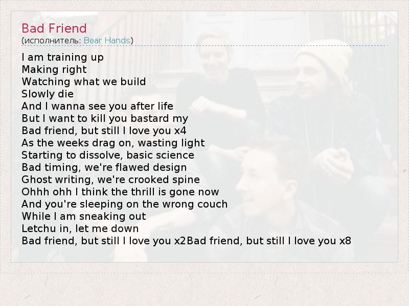 А как ты думаешь, о чем песня "Bad Friend" ?