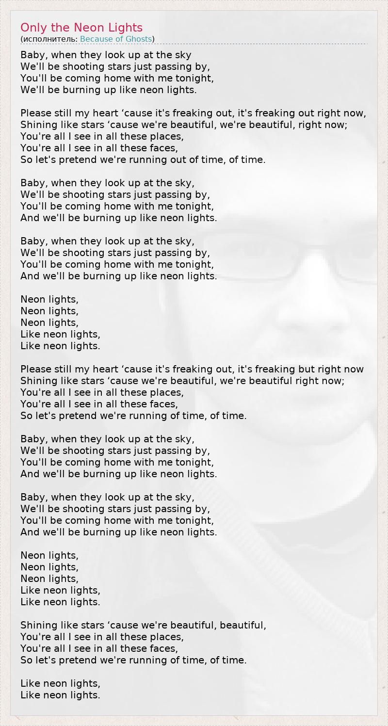 Малыш, когда они посмотрят в небо, Мы просто промелькнём, как метеоры, Сегодня ты пойдёшь домой со мной, Мы будем гореть, как неоновые огни. Пожалуйста, успокой моё сердце, потому что оно бьётся, как безумное, оно просто сходит с ума, Мы сияем, как звёзды, потому что сейчас мы прекрасны; Лишь тебя я вижу здесь, Лишь тебя я вижу среди этих лиц, Давай притворимся, будто у нас нет времени, нет времени. Малыш, когда они посмотрят в небо, Мы просто промелькнём, как метеоры, Сегодня ты пойдёшь домой со мной, Мы будем гореть, как неоновые огни. Малыш, когда они посмотрят в небо, Мы просто промелькнём, как метеоры, Сегодня ты пойдёшь домой со мной, Мы будем гореть, как неоновые огни. Неоновые огни, Неоновые огни, Неоновые огни, Как неоновые огни, Как неоновые огни. Пожалуйста, успокой моё сердце, потому что оно бьётся, как безумное, оно просто сходит с ума, но сейчас Мы сияем, как звёзды, потому что сейчас мы прекрасны; Лишь тебя я вижу здесь, Лишь тебя я вижу среди этих лиц, Давай притворимся, будто у нас нет времени, нет времени. Малыш, когда они посмотрят в небо, Мы просто промелькнём, как метеоры, Сегодня ты пойдёшь домой со мной, Мы будем гореть, как неоновые огни. Малыш, когда они посмотрят в небо, Мы просто промелькнём, как метеоры, Сегодня ты пойдёшь домой со мной, Мы будем гореть, как неоновые огни. Неоновые огни, Неоновые огни, Неоновые огни, Как неоновые огни, Как неоновые огни. Мы сияем, как звёзды, потому что сейчас мы прекрасны, прекрасны, Лишь тебя я вижу здесь, Лишь тебя я вижу среди этих лиц, Давай притворимся, будто у нас нет времени, нет времени. Как неоновые огни, Как неоновые огни.